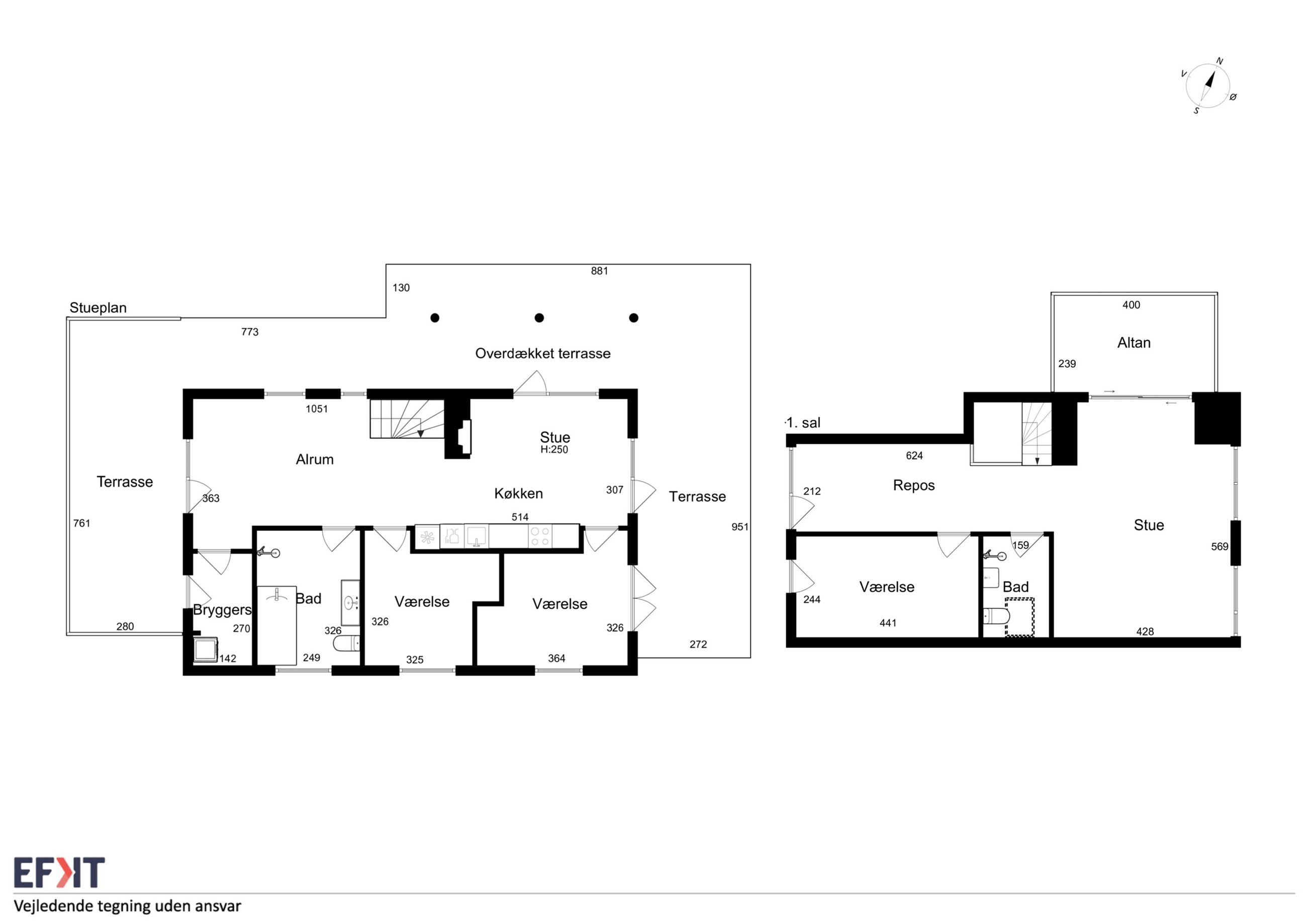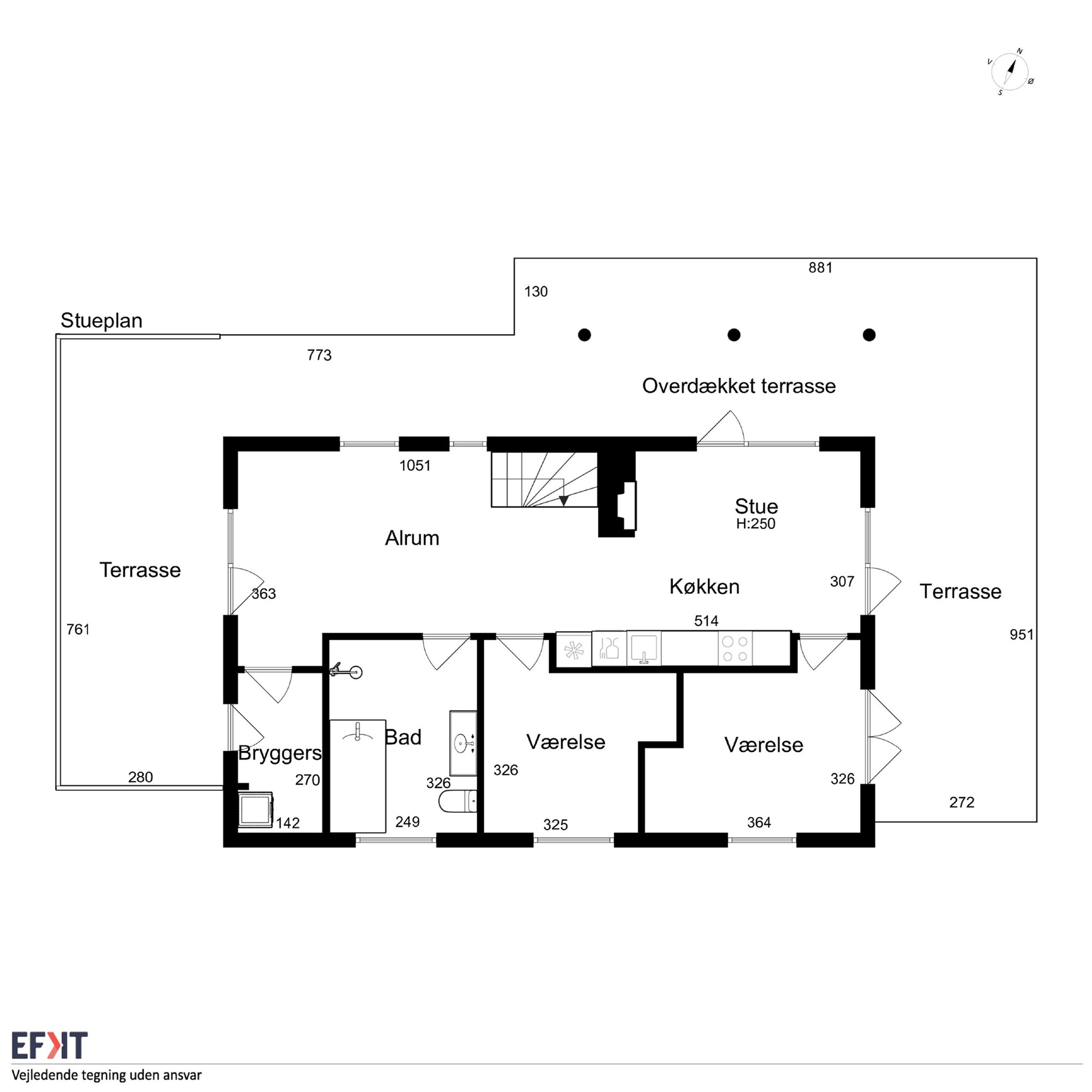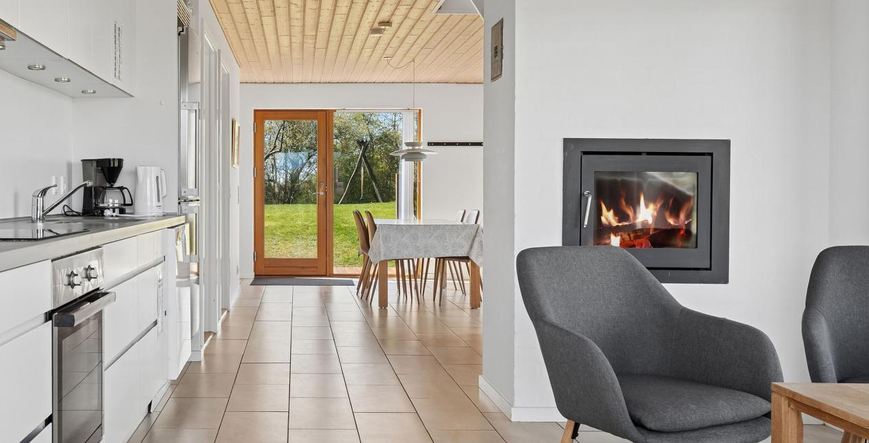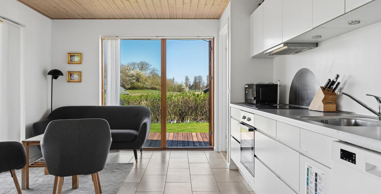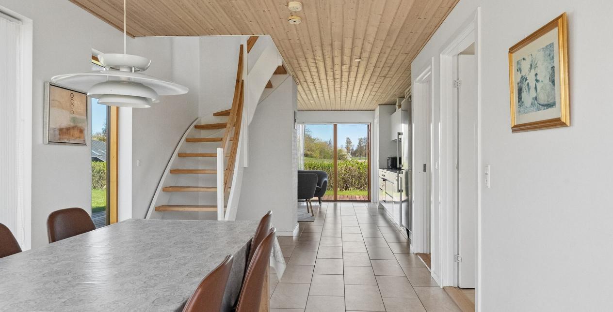 Integreret udhus/bryggers med vaskemaskine og tørretumbler. Indgang. Stort og velfungerende køkken/stue/alrum i eet, der er her klinkegulv med el-gulvvarme samt udgange til det dejlige terrasseområde/træterrasse. Soveværelse med udgang til terrassen. Værelse. Badeværelse med bruseniche, toilet, spa, toilet og vaskarrangement.