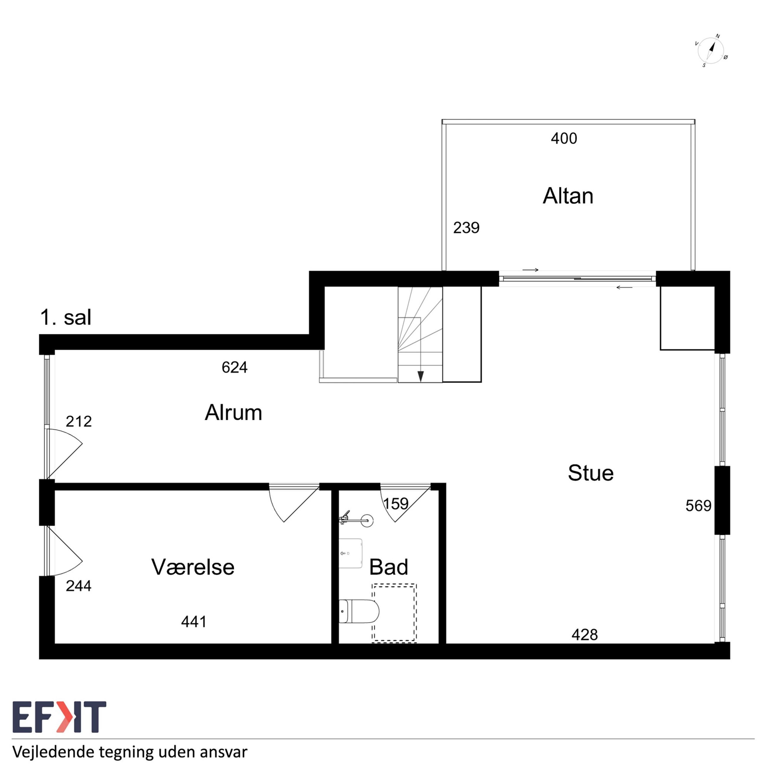 Førstesalen er udnyttet med: Dejlig stueafdeling med den flotteste udsigt over Grønsund og den smukke natur. Der er udgang til altan. Den ene del af 1. salen/opholdsrummet er indrettet så man kan have ekstra soveplads eller andet. Gæstebadeværelse samt soveværelse.