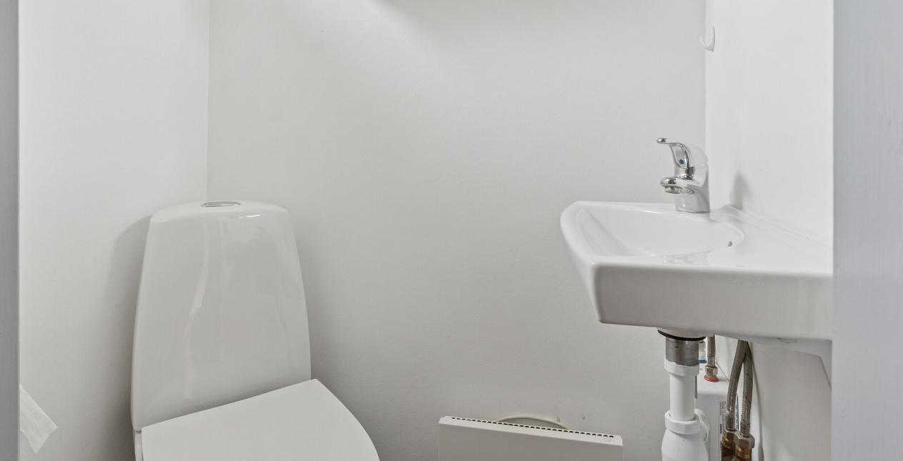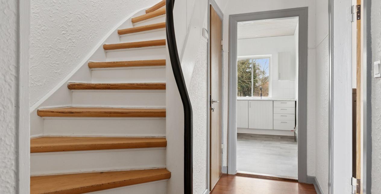 Huset indeholder: Entre med trappe til 1. sal samt kælder. Toilet med vask og flisegulv. Køkken med laminatgulv og direkte adgang til spisestuen. Spisestue med udgang til dejlig fliseterrasse. Opholdsstue med godt lysindfald.