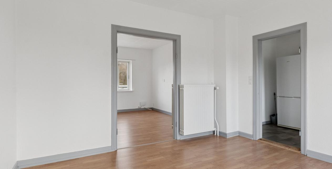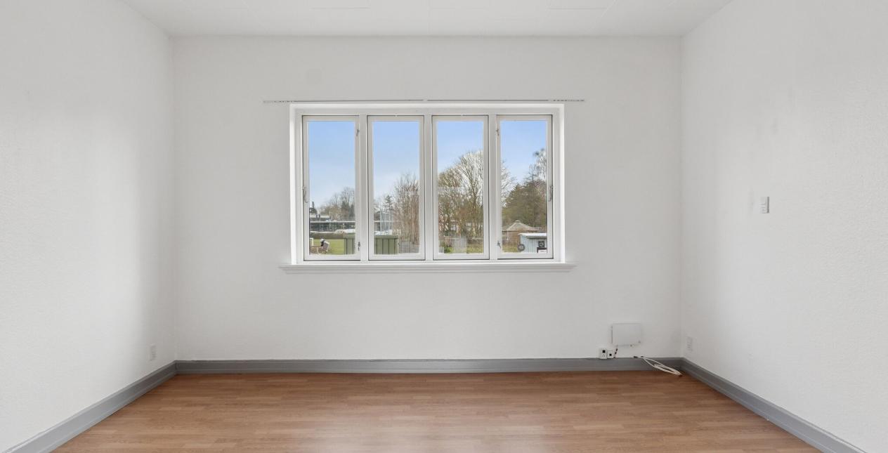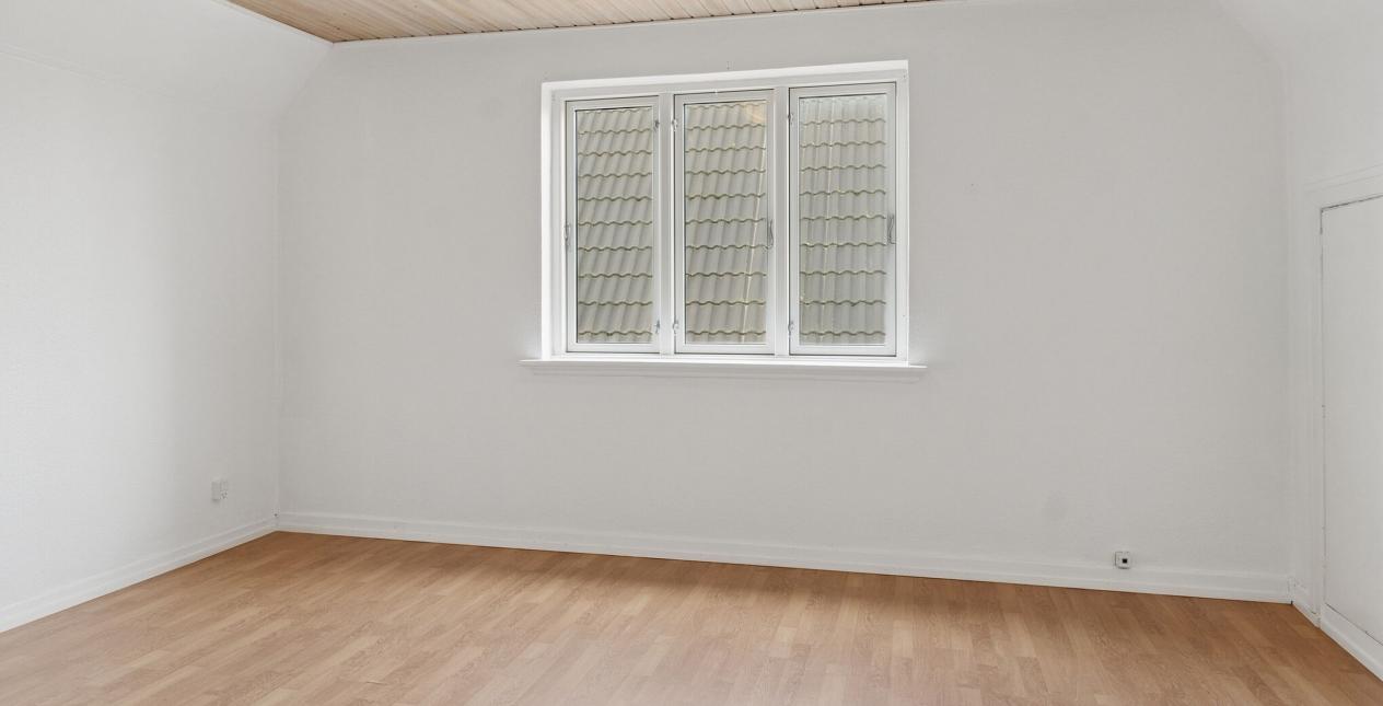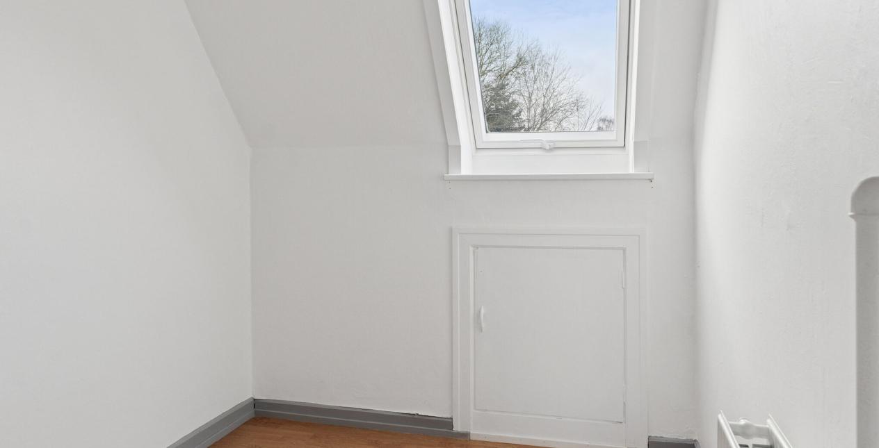 1.sal: Repos/fordelingsgang med trægulv. Stort soveværelse med indbyggede skabe og hylder. Gæsteværelse/kontor med foldedør.