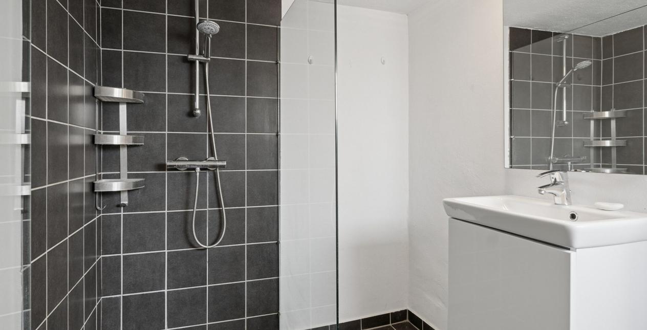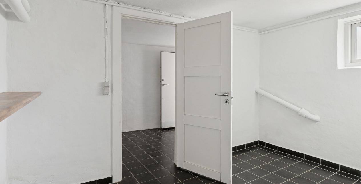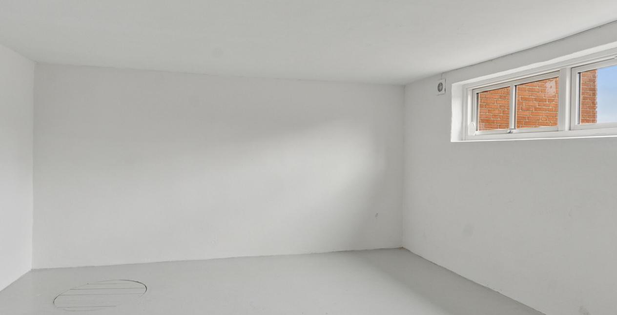 Kælder: Fordelingsgang med flisegulv og udgang til haven. Teknikrum med flisegulv. Godt hobbyrum med malet betongulv. Stort badeværelse med flisegulv og ligeledes plads til bryggers.