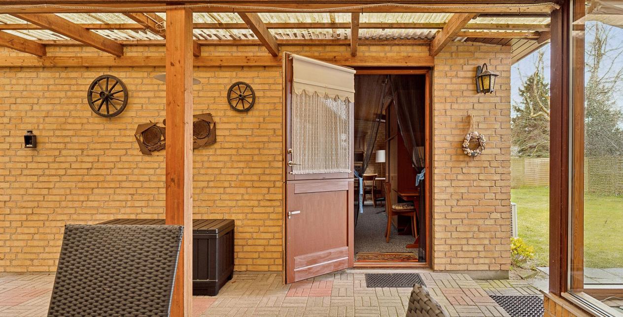 Entrè. Køkken. 2 værelser med trægulv og skab. Badeværelse med vaskemaskine, bruseniche, vask og toilet. Dejlig vinkelopholdsstue med luft til luft varmepumpe og brændeovn. Udgang til dejlig udestue, hvor det er næsten som at sidde i haven. Fra udestuen er der adgang til god overdækket terrasse.
