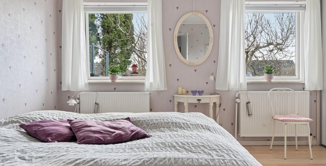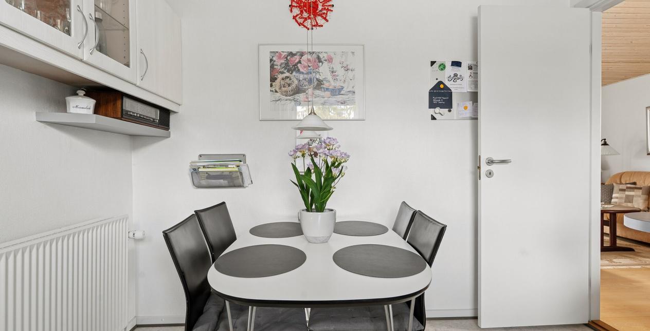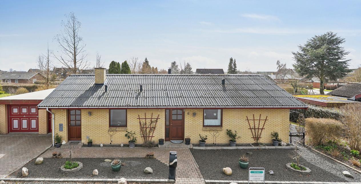 Entré med garderobeplads. Gæstetoilet med flisegulv og vask med skab. Spise- og opholdsstue med massivt trægulv, brændeovn og udgang til fed terrasse med kompositbrædder og elektrisk markise. Køkken med laminatgulv og lille spiseplads. Badeværelse med gulvvarme, flisegulv, toilet, håndklædetørrer, bruseniche og vask med skabe. Stort soveværelse med indbygget skab (tidligere 2 værelser). Kontor/gæsteværelse med massivt trægulv og indbygget skab. Bryggers med egen indgang, flisegulv, vask, skabe og stik til vaskemaskine.
