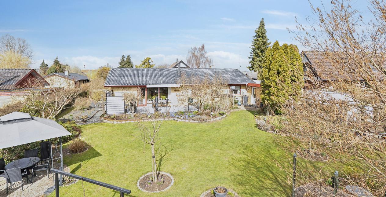 Grunden er dejligt beplantet, den er både solrig og dejlig velbeplantet, her kan børnene spille fodbold, og familien kan hygge på terrassen.