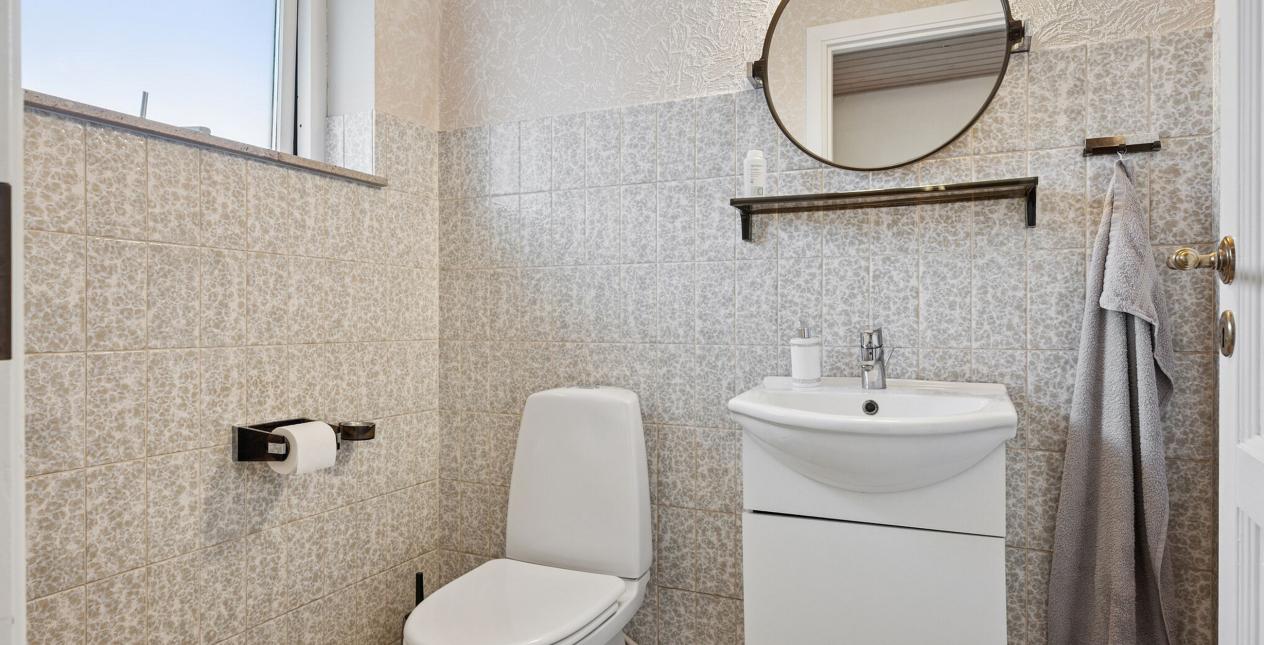 Du træder ind i den rummelige entré med god plads til overtøjet. Herfra har du adgang til gæstetoilet og via fordelingsgangen har du adgang til husets tre værelser der alle byder på gode størrelser. Fra fordelingsgangen har du også adgang til husets badeværelse med toilet, brus og vask.
