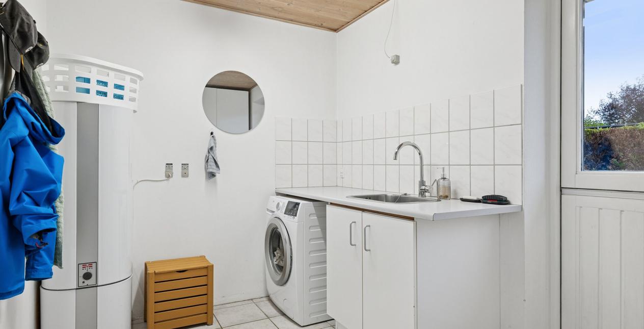 I forbindelse med stuen har du det nydelige køkken med spiseplads, herfra har du udgang til bryggerset med installation til vaskemaskinen. Fra bryggerset har du udgang til terrasse og have.