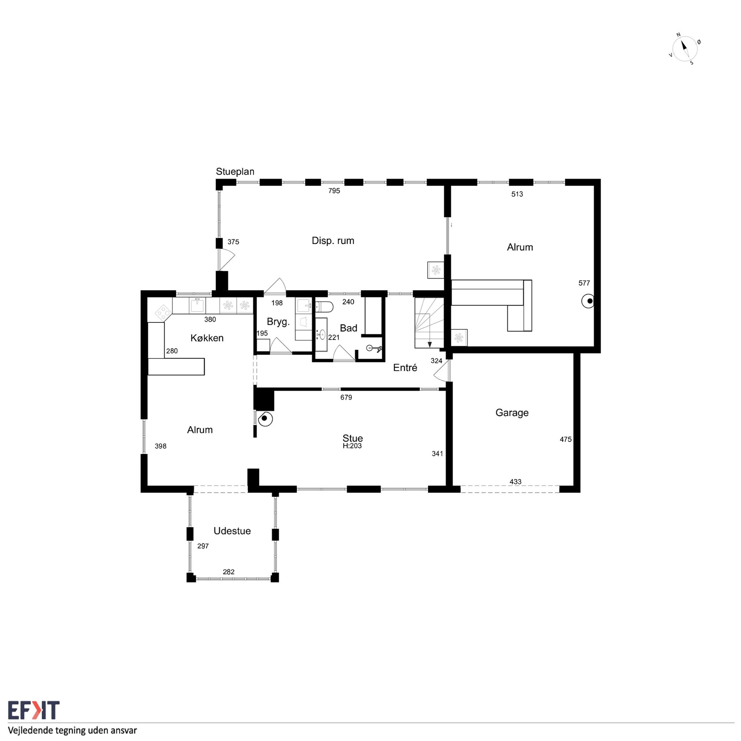 Indretningen er bestående af: Entré med flisegulv og trappe til 1. salen. Badeværelse med elgulvvarme (ligeledes forberedt til luft-til-vand gulvvarme), flisegulv, vask med skabe, bruseniche og masser af skabe. Bryggers med flisegulv, stik til vaskemaskine, vask og skabe. Køkken i træ med åbning til spisestuen (der er Junckers trægulve under køkkengulvet). Spisestue med Junckers trægulve og varmepumpe. Stor opholdsstue med Junckers trægulve og pilleovn. Ekstra opholdsstue med flisegulv.