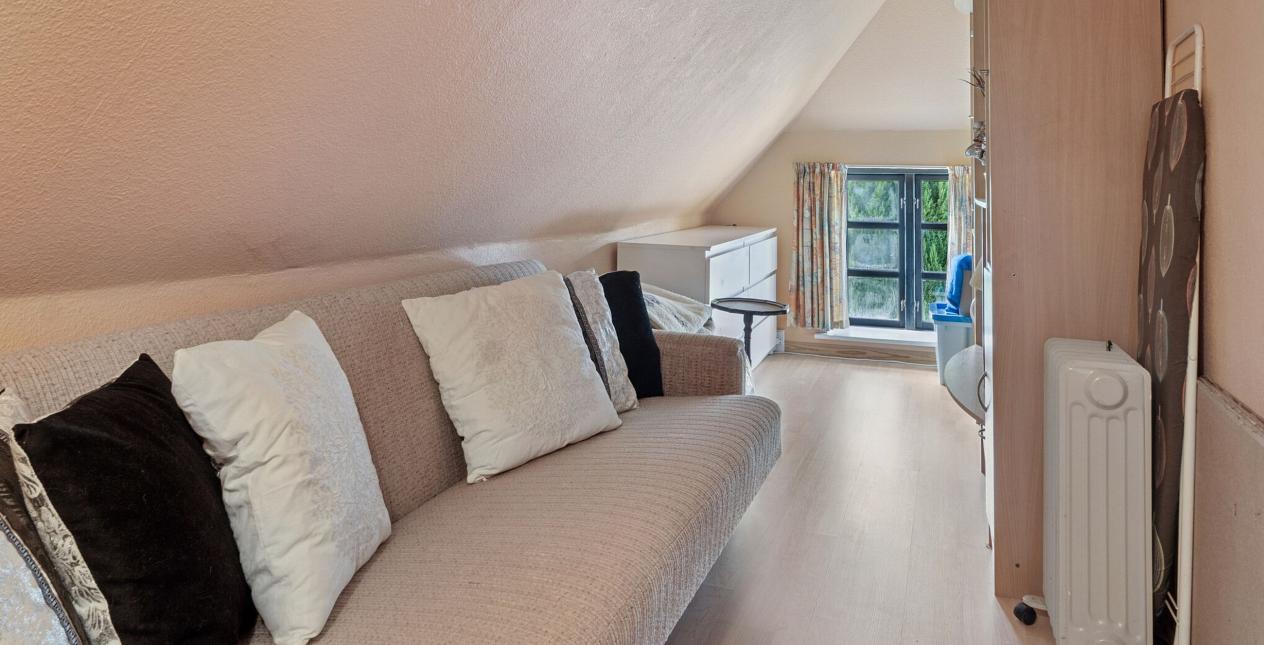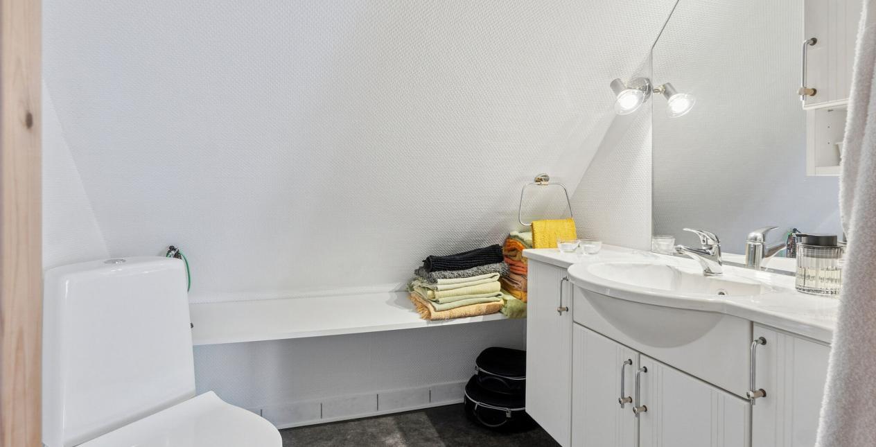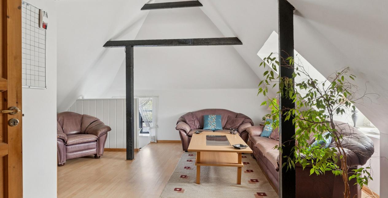 1.sal: Stor ekstra opholdsstue med mulighed for indretning af ekstra værelse. Toilet med linoleumsgulv og vask med skabe. Gæste-/børneværelse. Stort soveværelse med indbyggede skabe. Hele 1. salen har loft til kip med fritliggende bjælker.