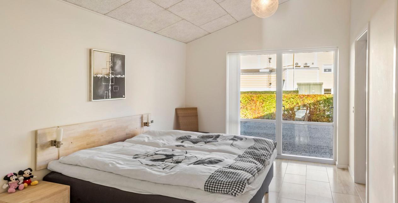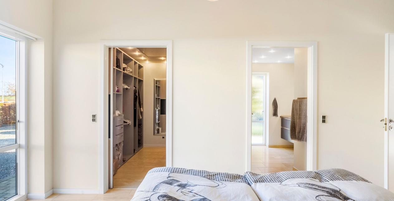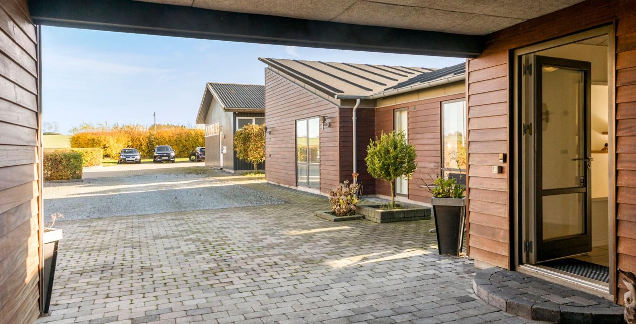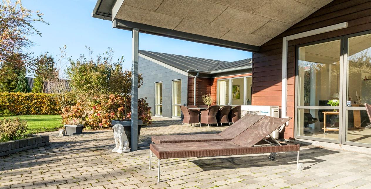 Det åbne køkken/alrum fungerer som husets hjerte med direkte adgang til en sydvendt fliseterrasse, hvor solrige dage kan nydes fuldt ud. Forældreafdelingen er et privat fristed med eget walk-in closet og lækkert badeværelse. En hyggelig stue leder videre til en overdækket terrasse - ideel til afslapning.