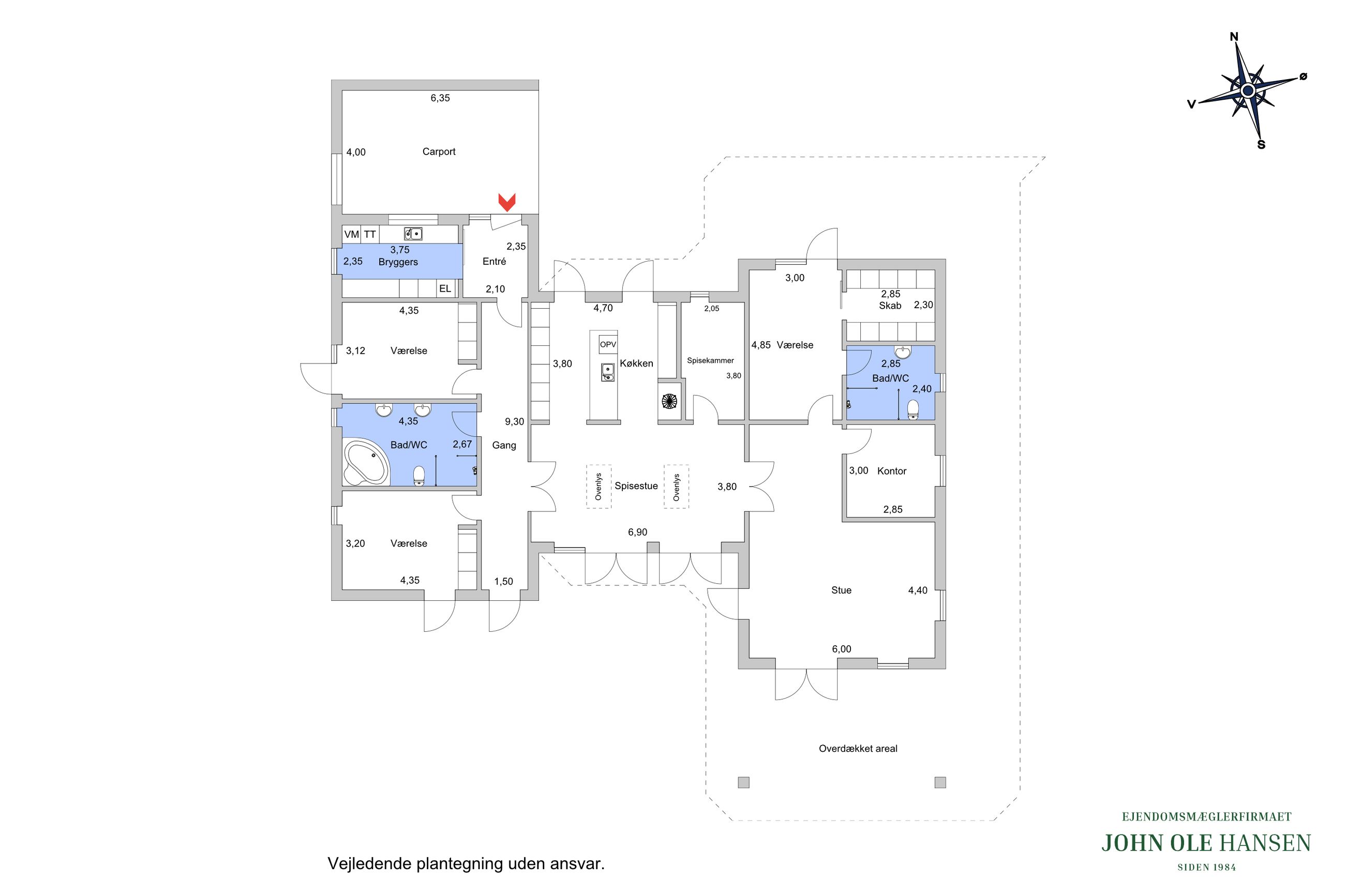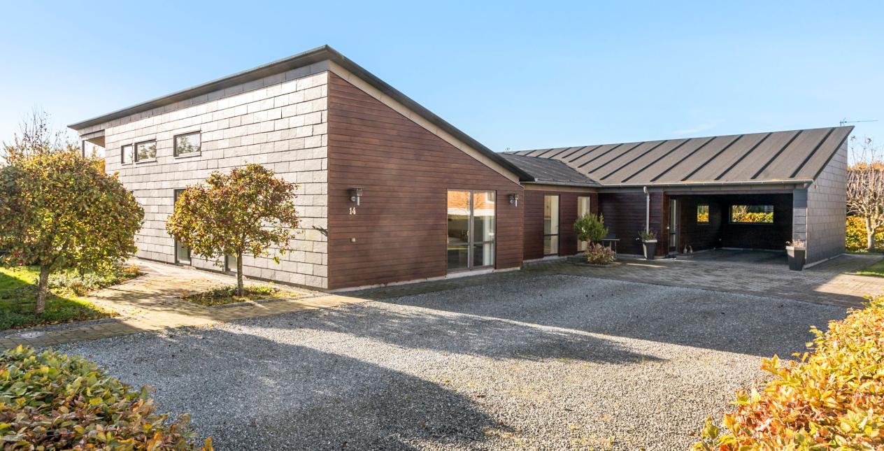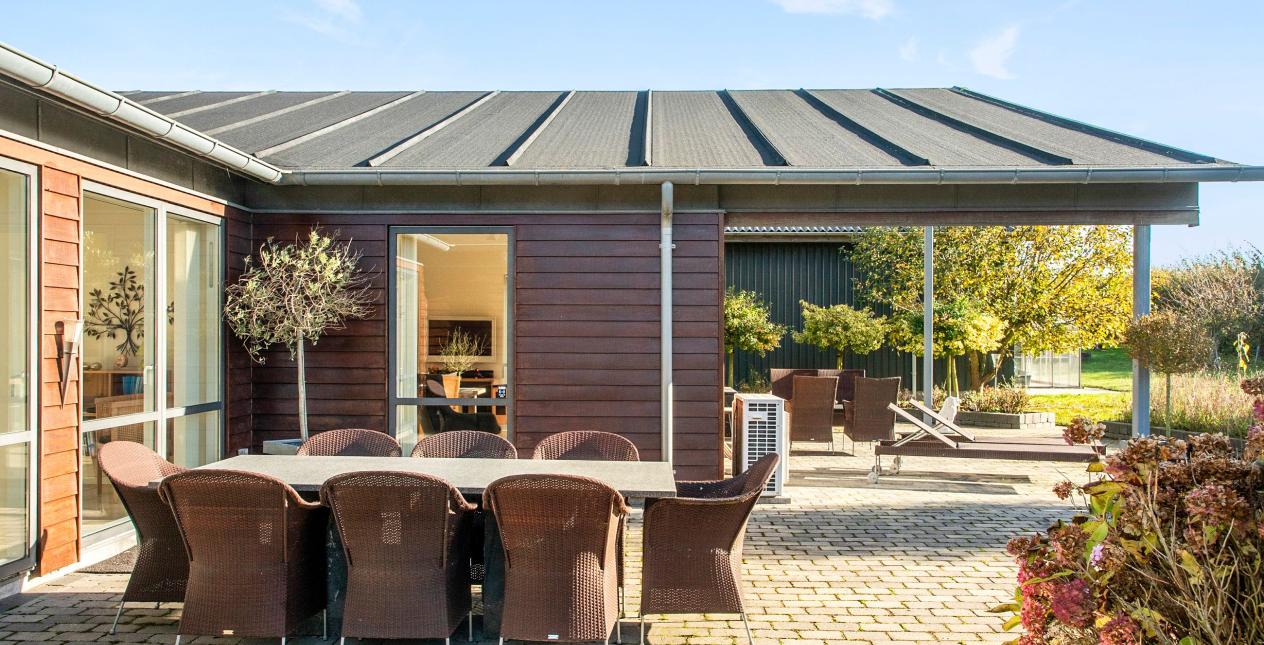 Det åbne køkken/alrum fungerer som husets hjerte med direkte adgang til en sydvendt fliseterrasse, hvor solrige dage kan nydes fuldt ud. Forældreafdelingen er et privat fristed med eget walk-in closet og lækkert badeværelse. En hyggelig stue leder videre til en overdækket terrasse - ideel til afslapning.