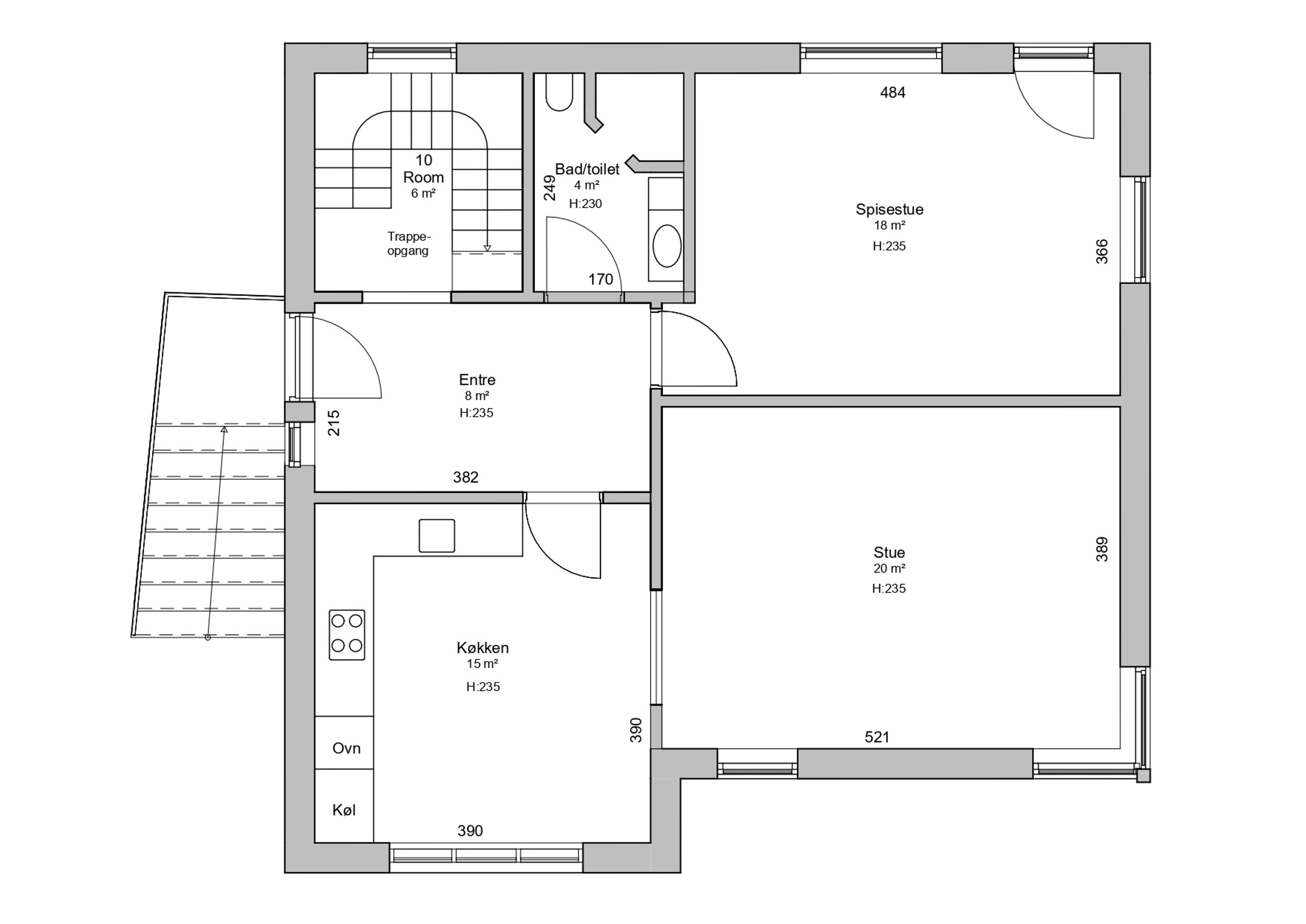 Huset har en god atmosfære, og har gode lysindfald. Indretningen er bestående af: