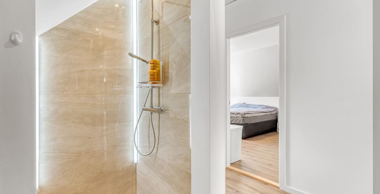 Første sal er udnyttet med: Repos / fordelingsgang. Dejligt soveværelse, 2 pæne værelser. Flot badeværelse med bruseniche, vedhængt toilet, vaske og opbevaringsplads.