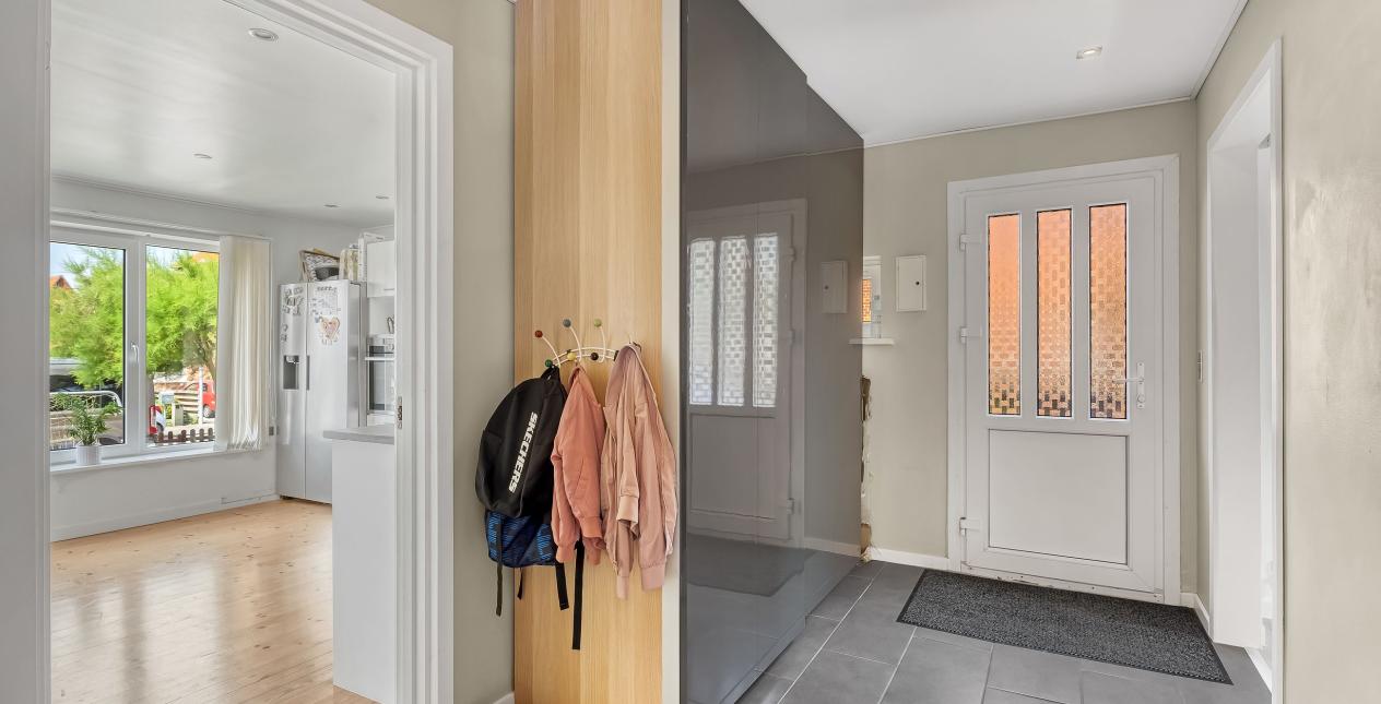 Entrè med klinker på gulv og garderobeskab. Dejligt køkken alrum med lyse elementer og trægulv. I åben forbindelse med køkken er en hyggelig stue, her er også trægulv. Spisestue med udgang til terrasse og haven. Badeværelse med bruseniche, vask, vedhængt toilet og gulvvarme.