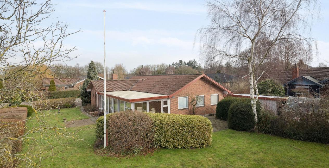Haven er nem at vedligeholde og samtidig charmerende med sine grønne omgivelser. Ejendommen ligger fredeligt for enden af en lukket vej med sikre stisystemer direkte til skolen - ideelt for børnefamiliens hverdag. Desuden har området meget at byde på, såsom nærhed til skovområder, golfbane samt diverse indkøbsmuligheder.