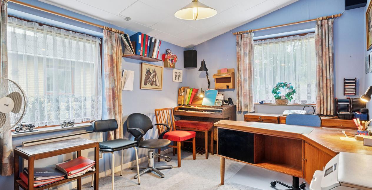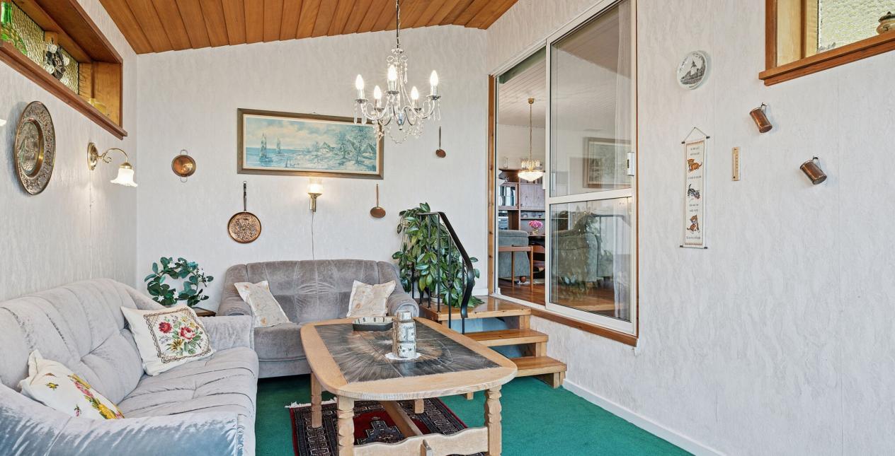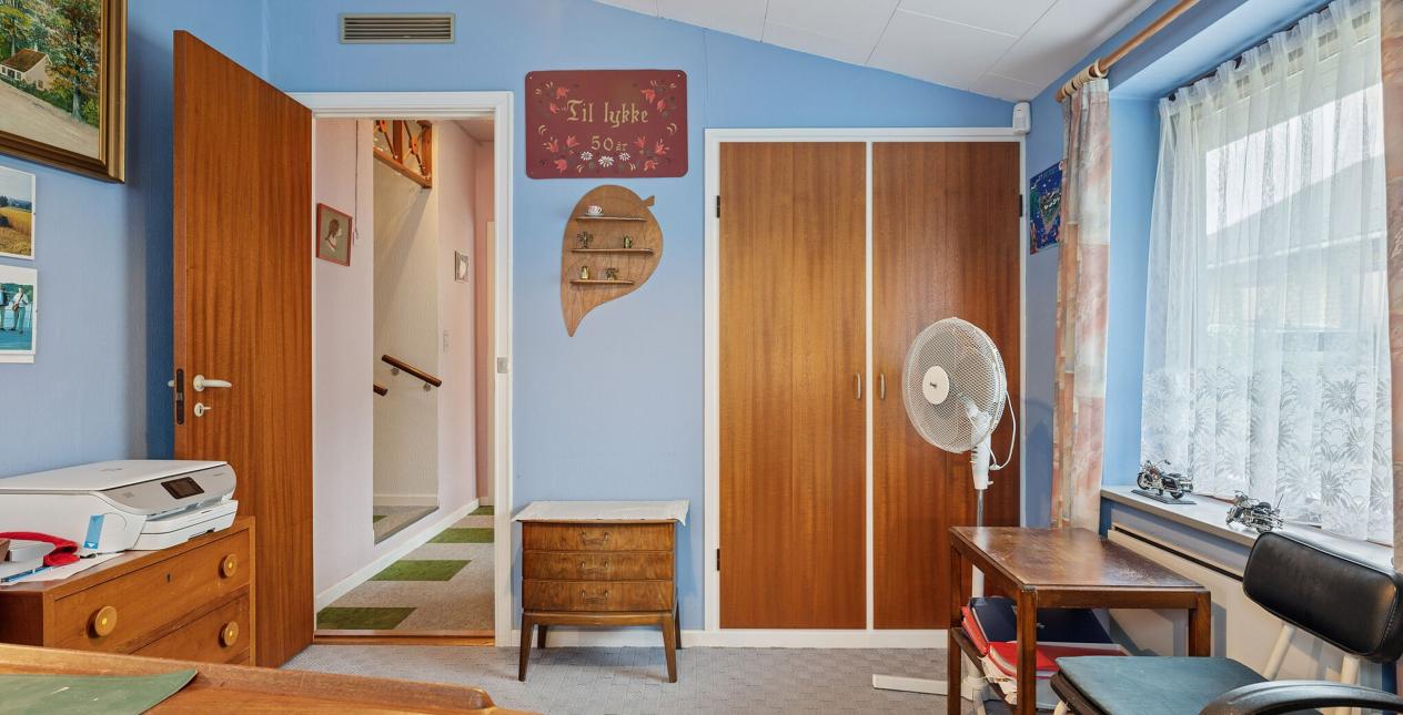 Indeholder: Entre/indgangsparti med flisegulv. Fordelingsgang med gulvtæppe, betongulv under og indhak til garderobe. Bryggers med egen indgang via garagen, stik til vaskemaskine, flisegulv, vask og skabe. Gæstetoilet med flisegulv og vask. Badeværelse med gulvvarme, flisegulv, bruseniche, vask, skabsplads og toilet. Soveværelse med indbyggede skabe. 1 trin ned til åbent kontor med indbyggede skabe og adgang til de 2 børneværelser, ligeledes med indbyggede skabe. Køkken med laminatgulv og lille spiseplads. Stor spise- og opholdsstue med parketgulv og udgang til den store overdækkede fliseterrasse. Ekstra stue i lavere niveau med udgang til fliseterrasse.