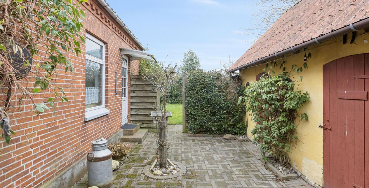 Huset er omkranset af en dejlig have med plads til familie hygge på terrassen og boldspil på græsplænen, flot kastanjetræ, æbletræ og anden variation af buske og planter. Skønt "gårdmiljø" mellem huset og bagbygningen, hvor man kan tilbringe hyggelige stunder sammen med familien.