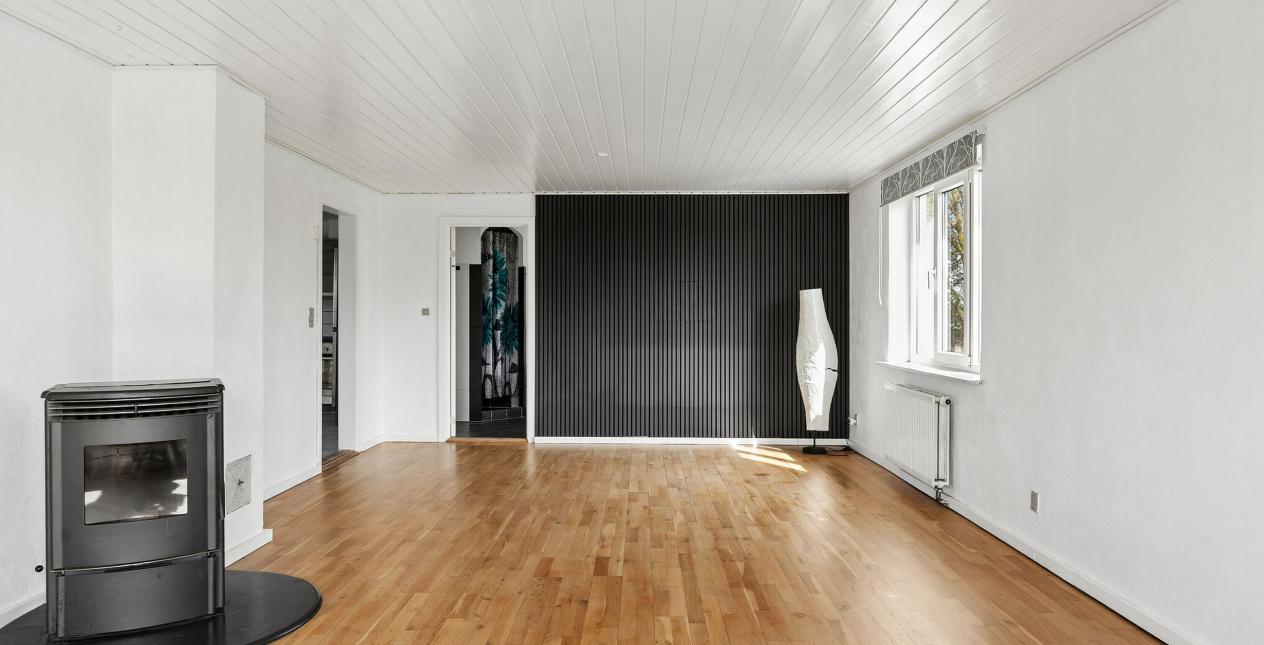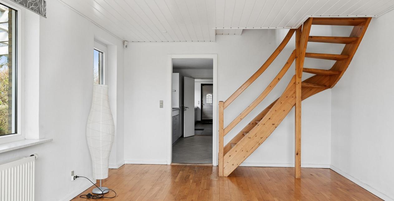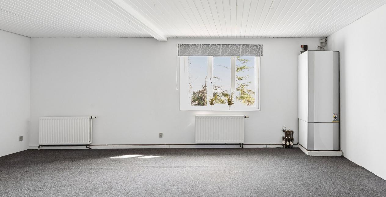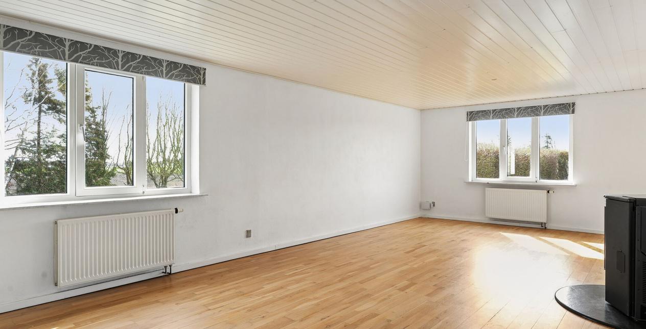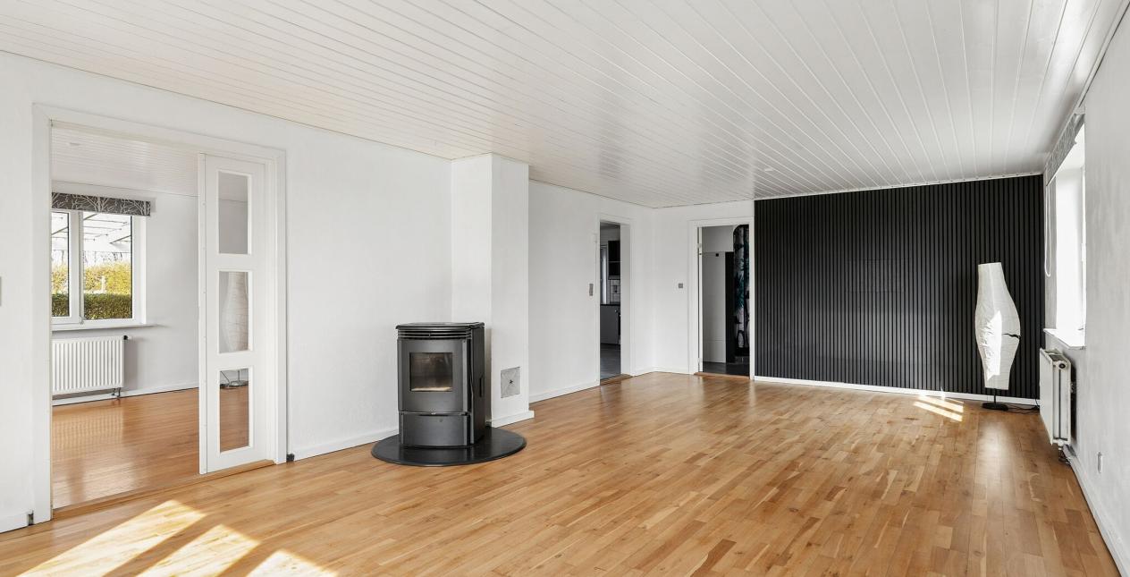 Indeholder: Meget stor lys entré/bryggers med gulvvarme, flisegulv, stik til vaskemaskine, håndvask i skabsarrangement og udgang til garage. Stort soveværelse med gulvtæppe og betongulv under. Dejligt spisekøkken med gulvvarme og flisegulv. Spisestue med trappe til 1. sal og udgang til haven. Lys stor spise-/opholdsstue med pilleovn. Badeværelse med gulvvarme, flisegulv, bruseniche, spabad, væghængt toilet, vask og masser af skabsplads.