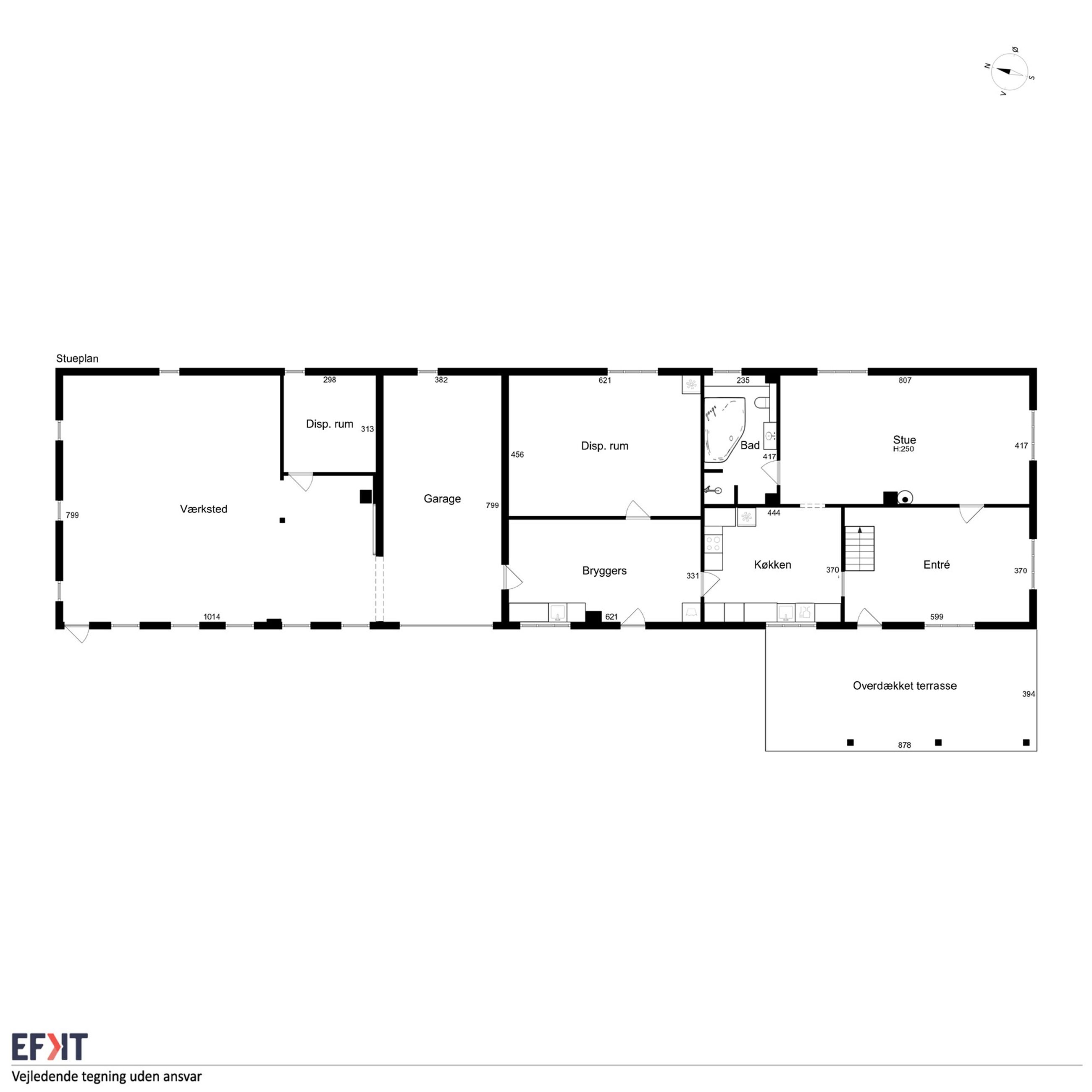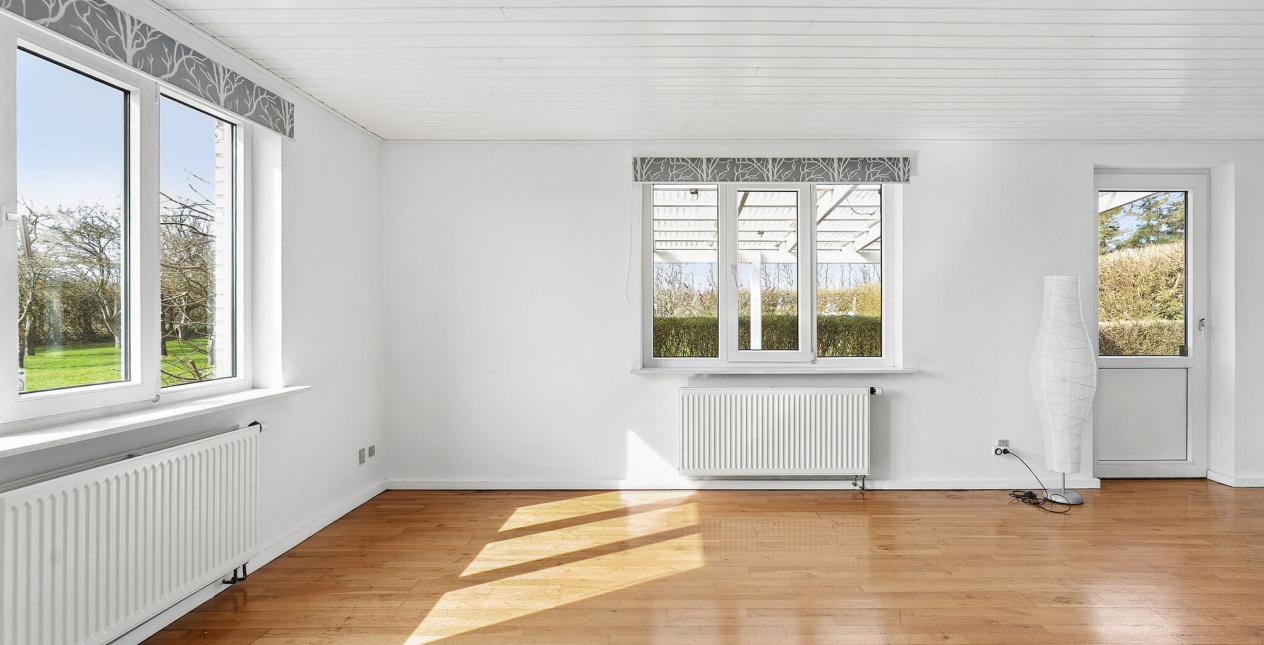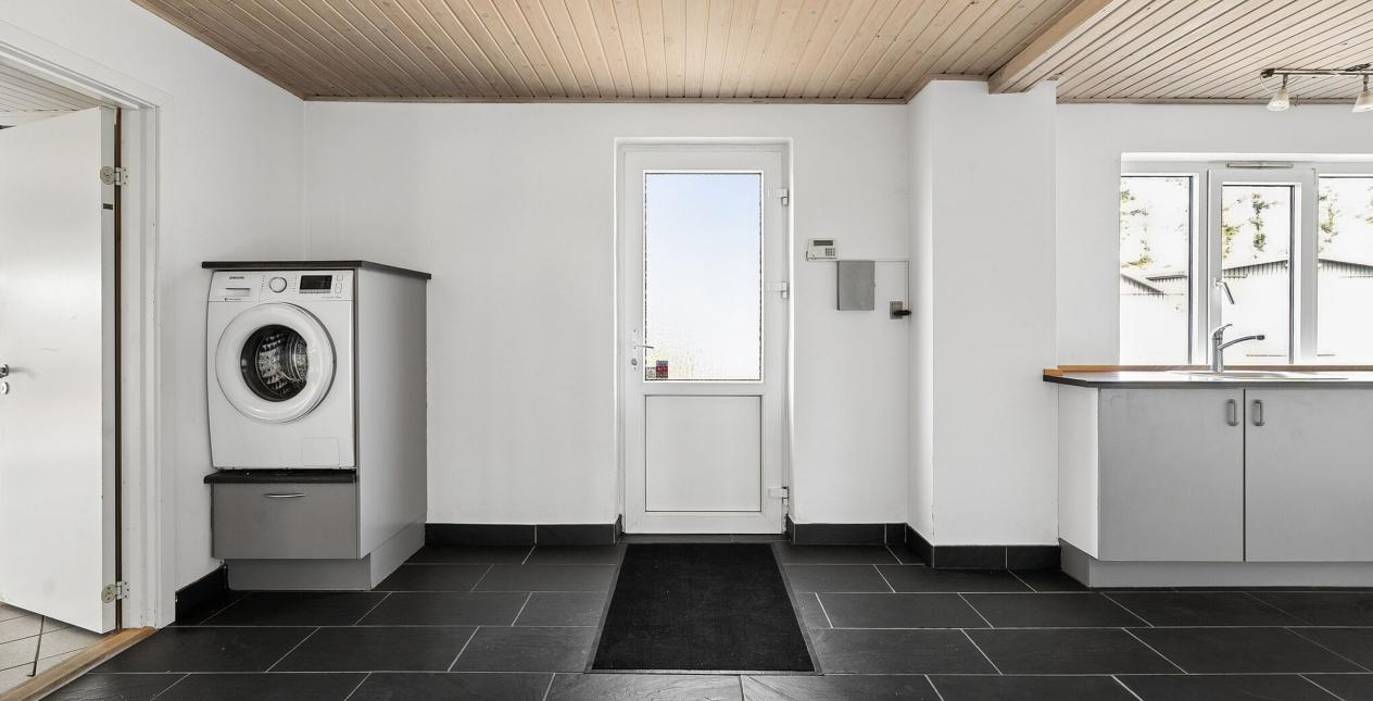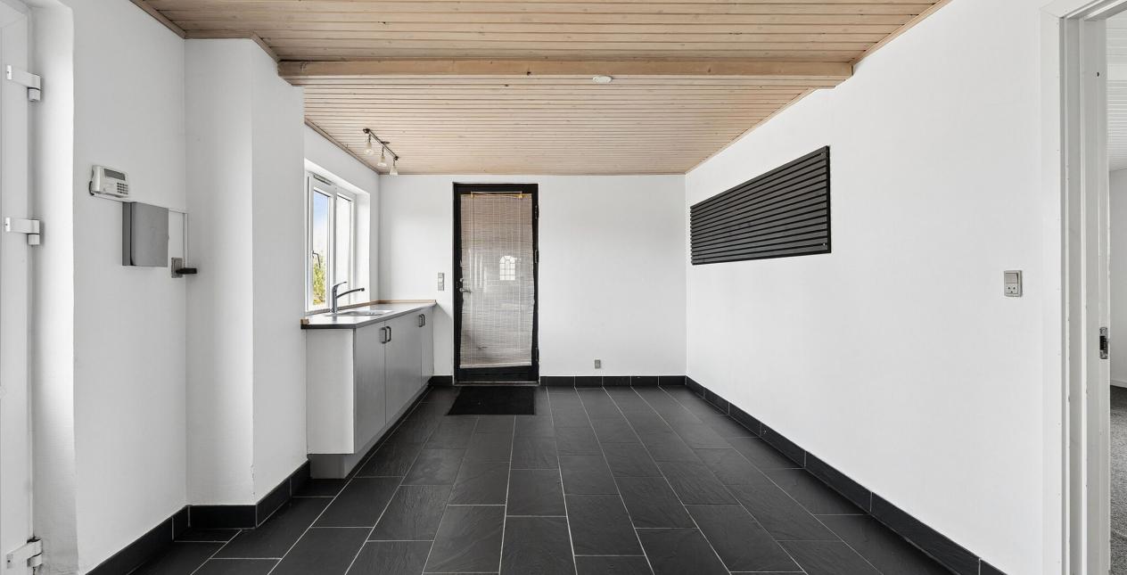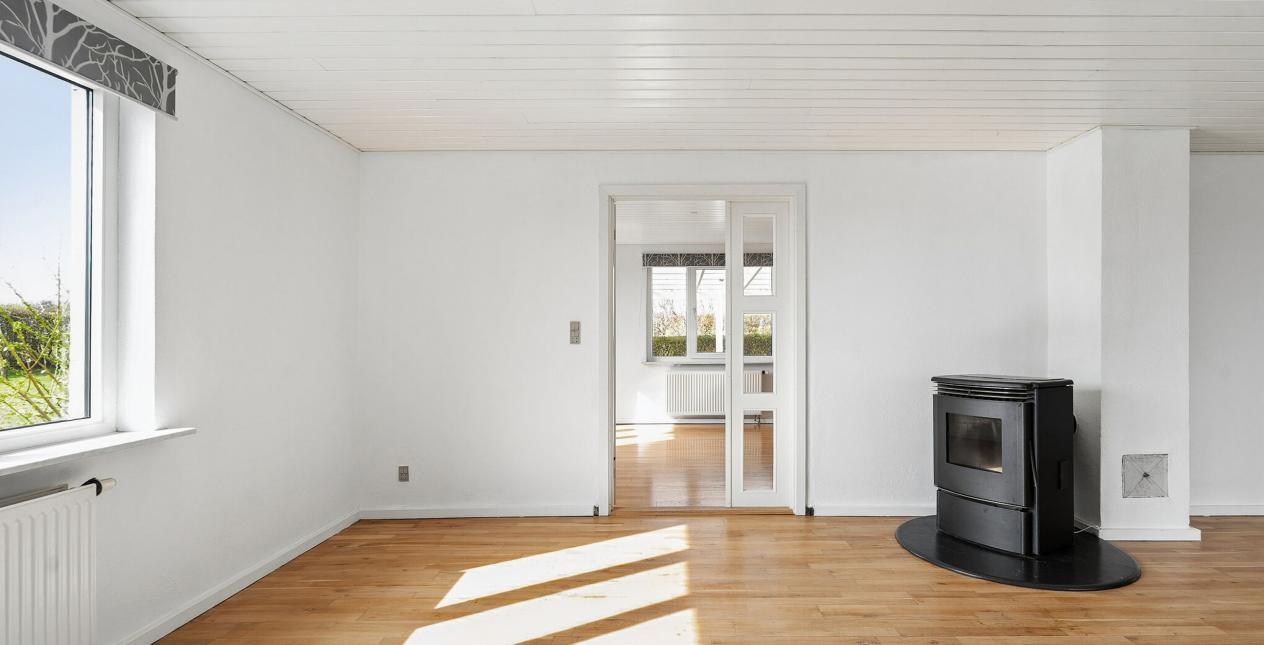 Indeholder: Meget stor lys entré/bryggers med gulvvarme, flisegulv, stik til vaskemaskine, håndvask i skabsarrangement og udgang til garage. Stort soveværelse med gulvtæppe og betongulv under. Dejligt spisekøkken med gulvvarme og flisegulv. Spisestue med trappe til 1. sal og udgang til haven. Lys stor spise-/opholdsstue med pilleovn. Badeværelse med gulvvarme, flisegulv, bruseniche, spabad, væghængt toilet, vask og masser af skabsplads.