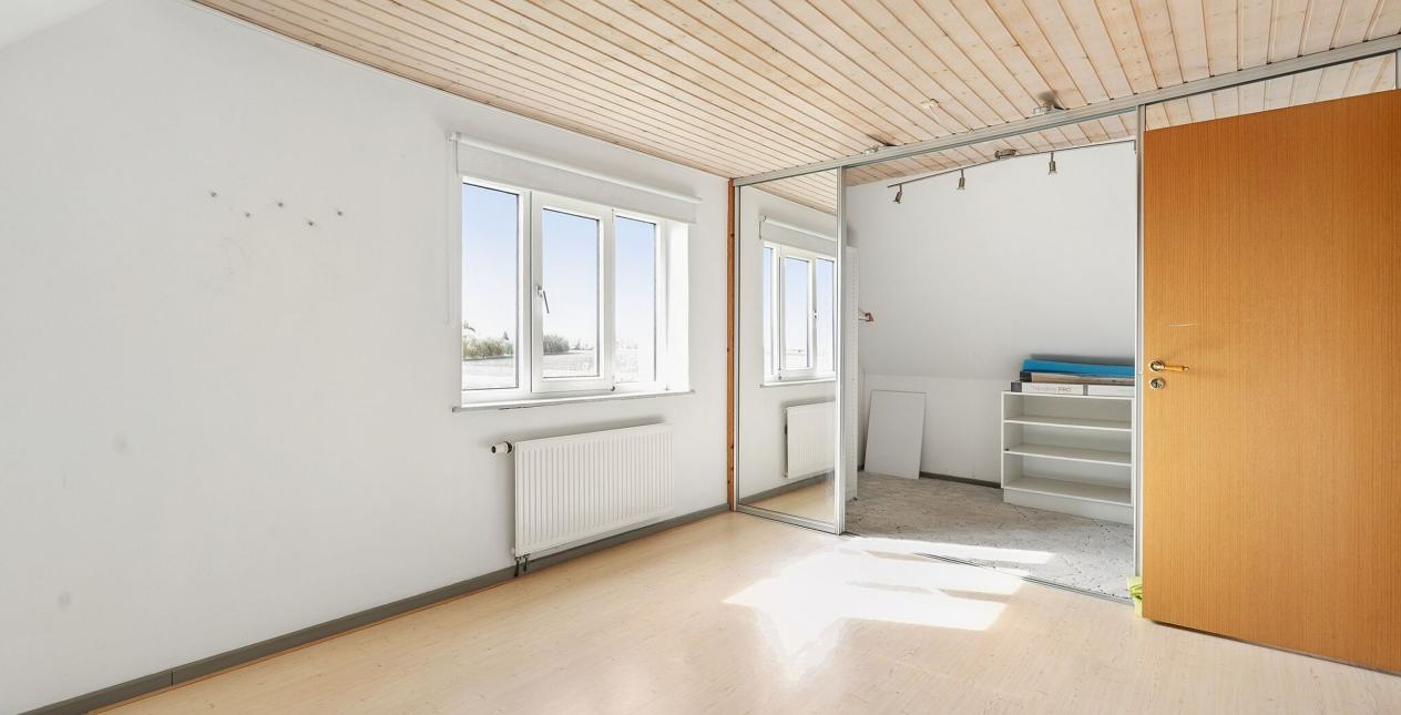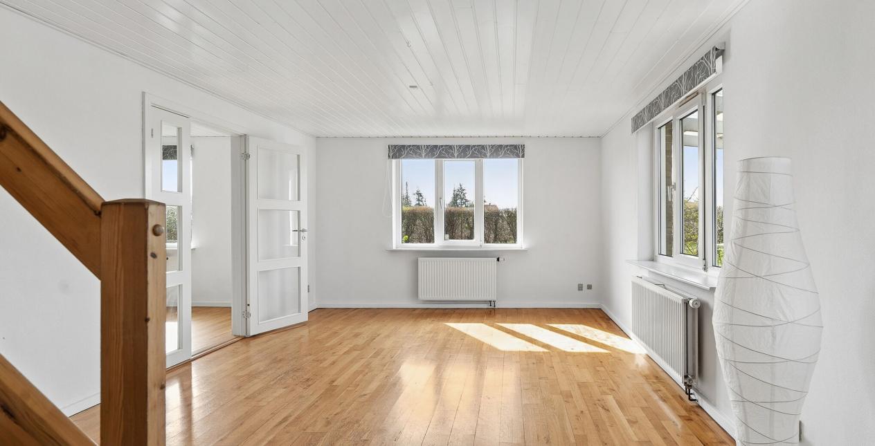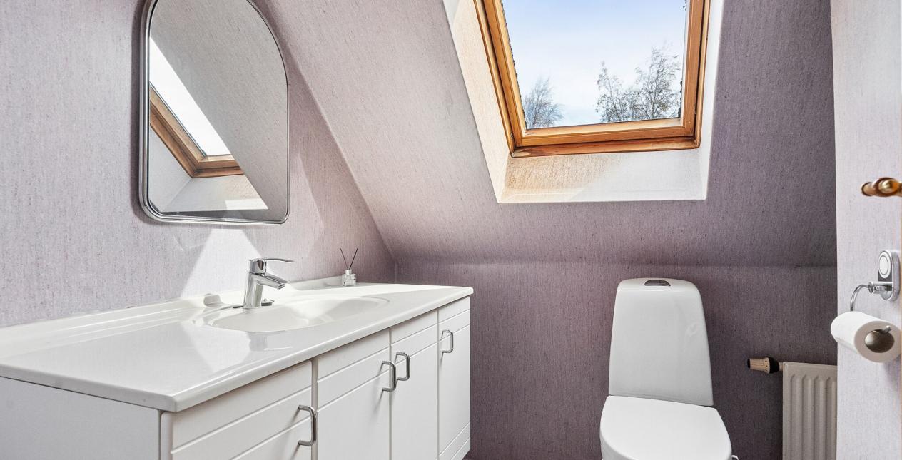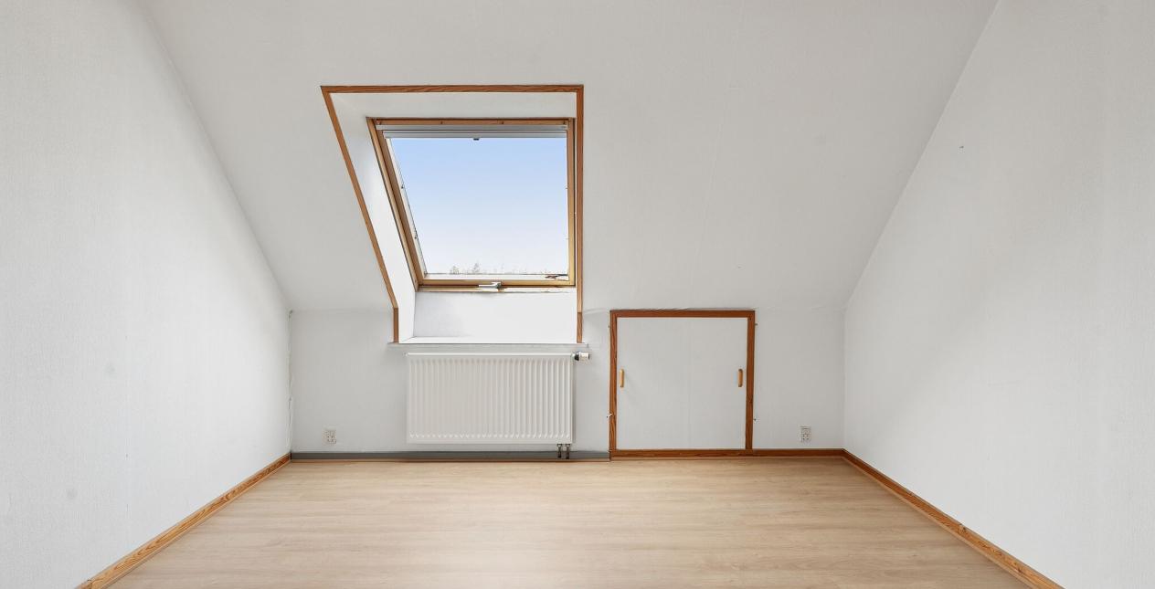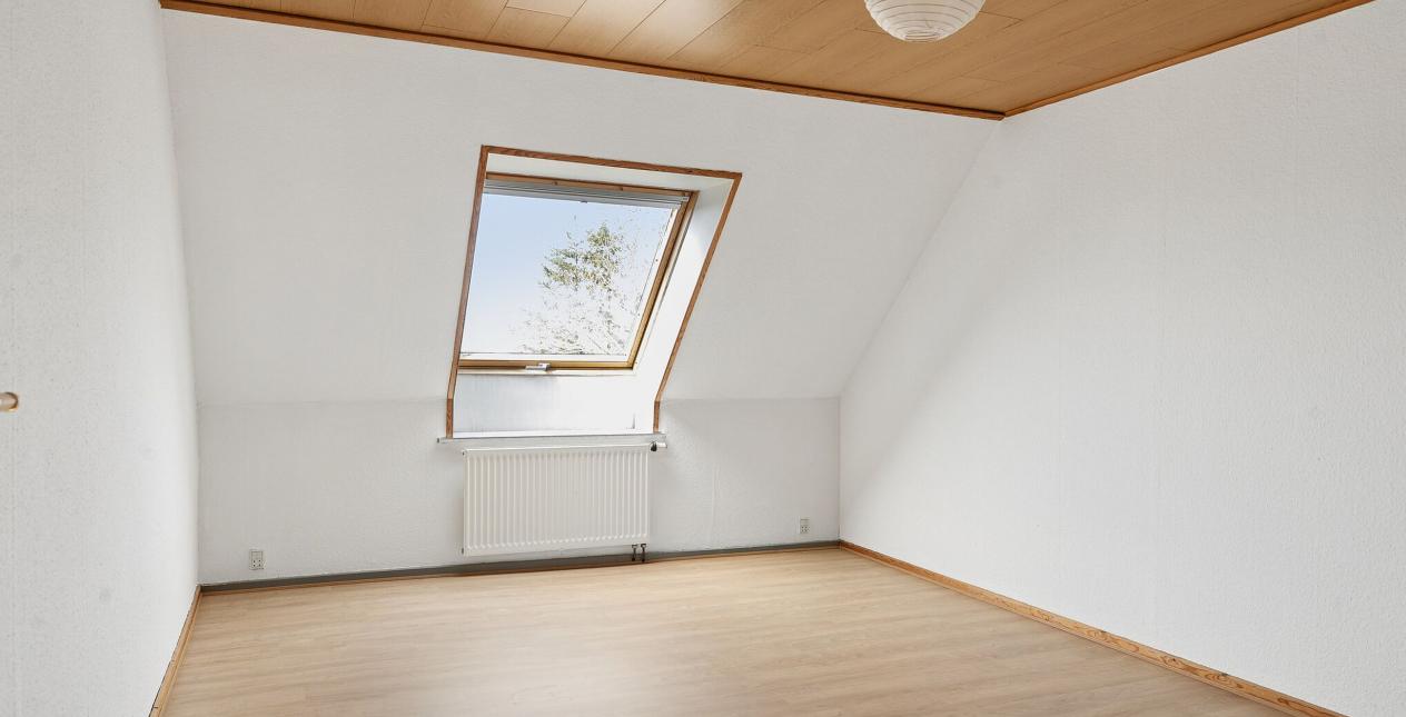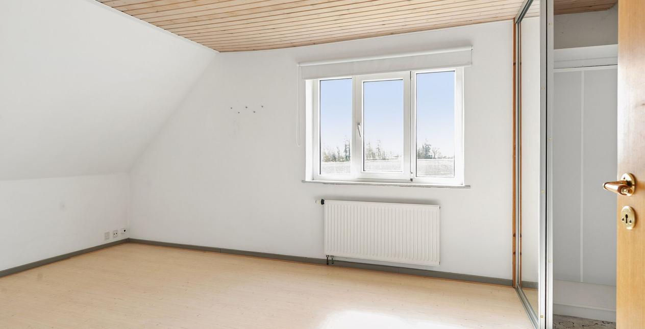 1.sal: Stort soveværelse med skydelåger til walk-in closet. Badeværelse med vinylbelægning, bruseniche (brus er afblændet), toilet og vask. Ydermere 3 meget store værelser. Udgang fra fordelingsgang til stort uudnyttet loftrum.