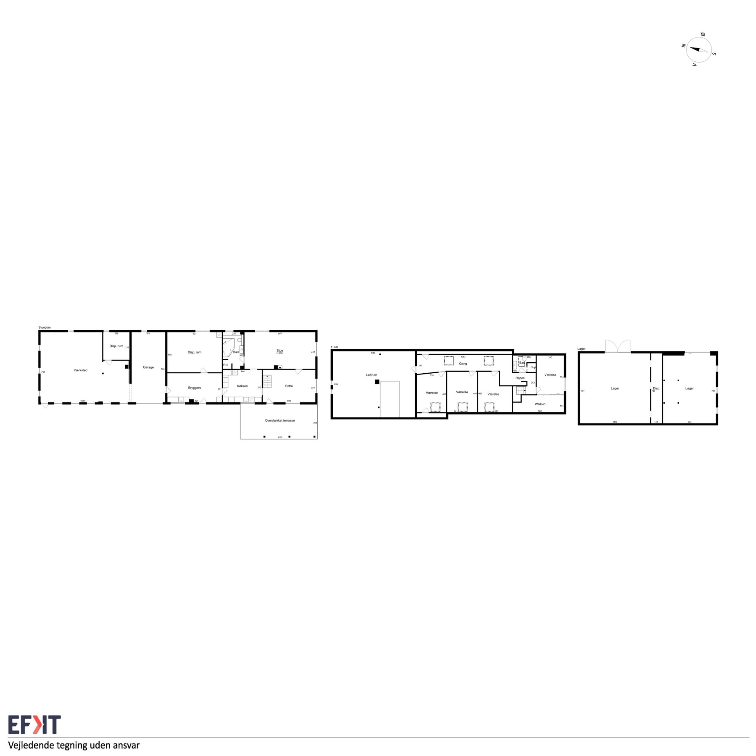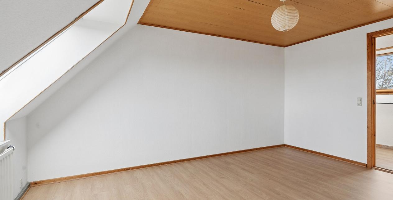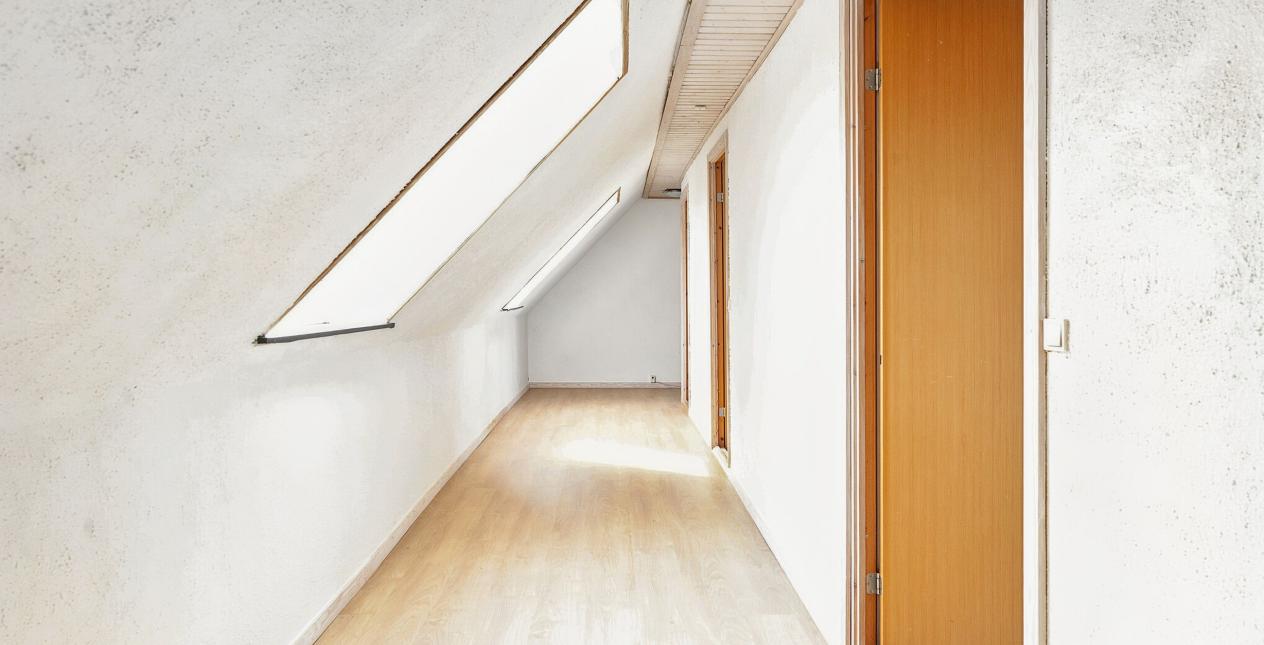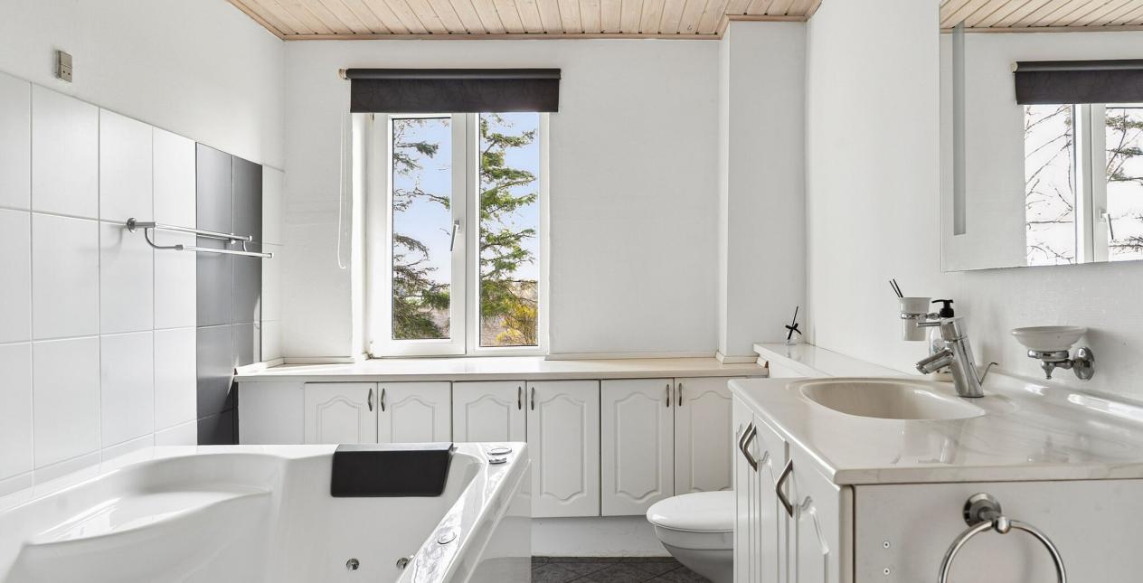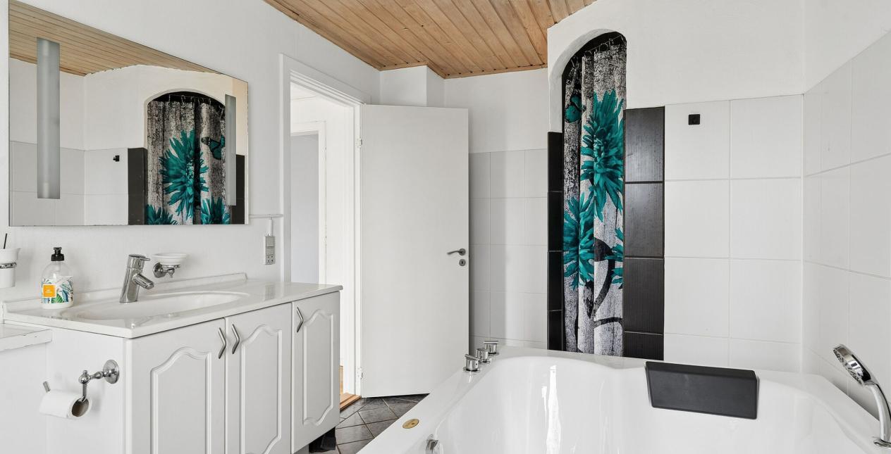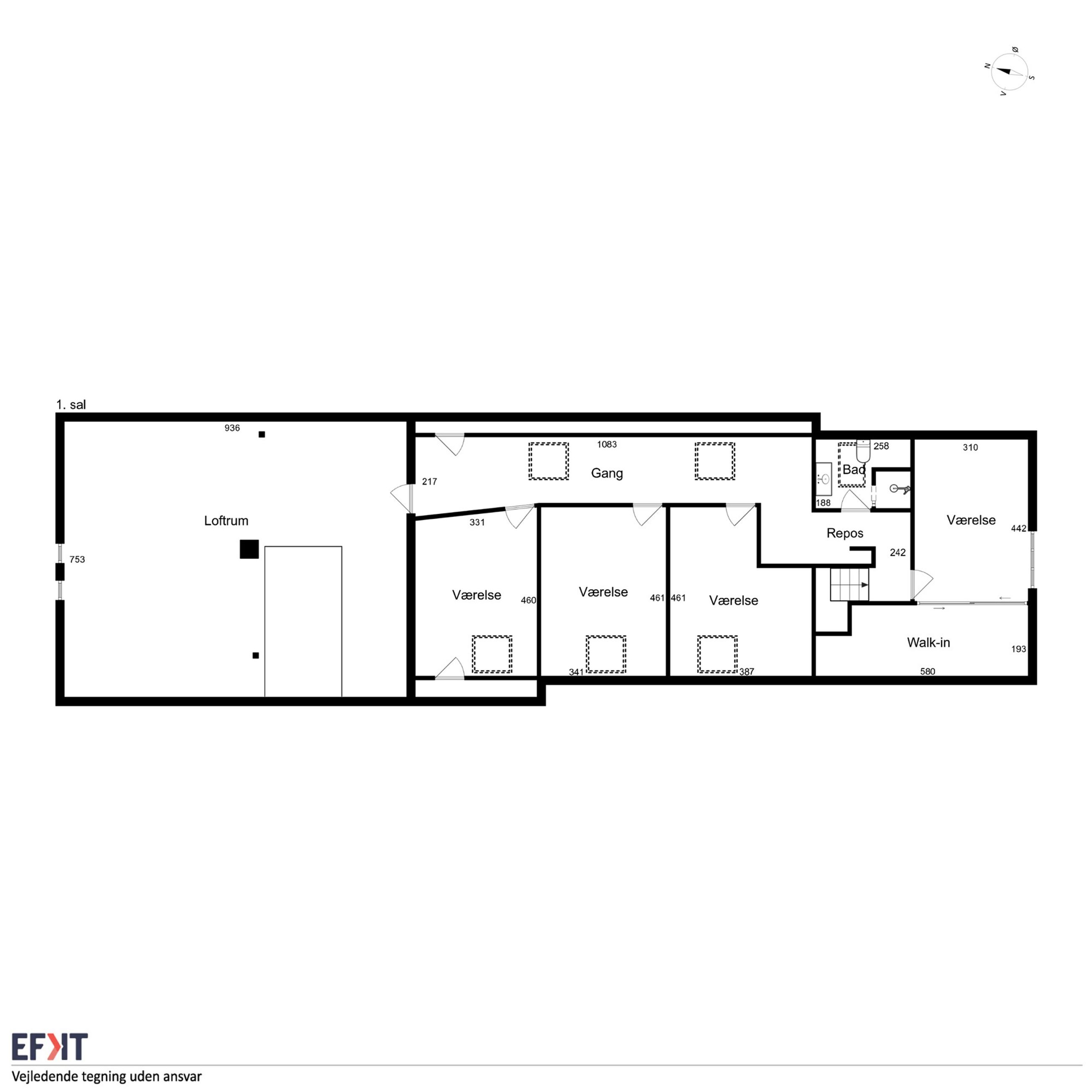 1.sal: Stort soveværelse med skydelåger til walk-in closet. Badeværelse med vinylbelægning, bruseniche (brus er afblændet), toilet og vask. Ydermere 3 meget store værelser. Udgang fra fordelingsgang til stort uudnyttet loftrum.