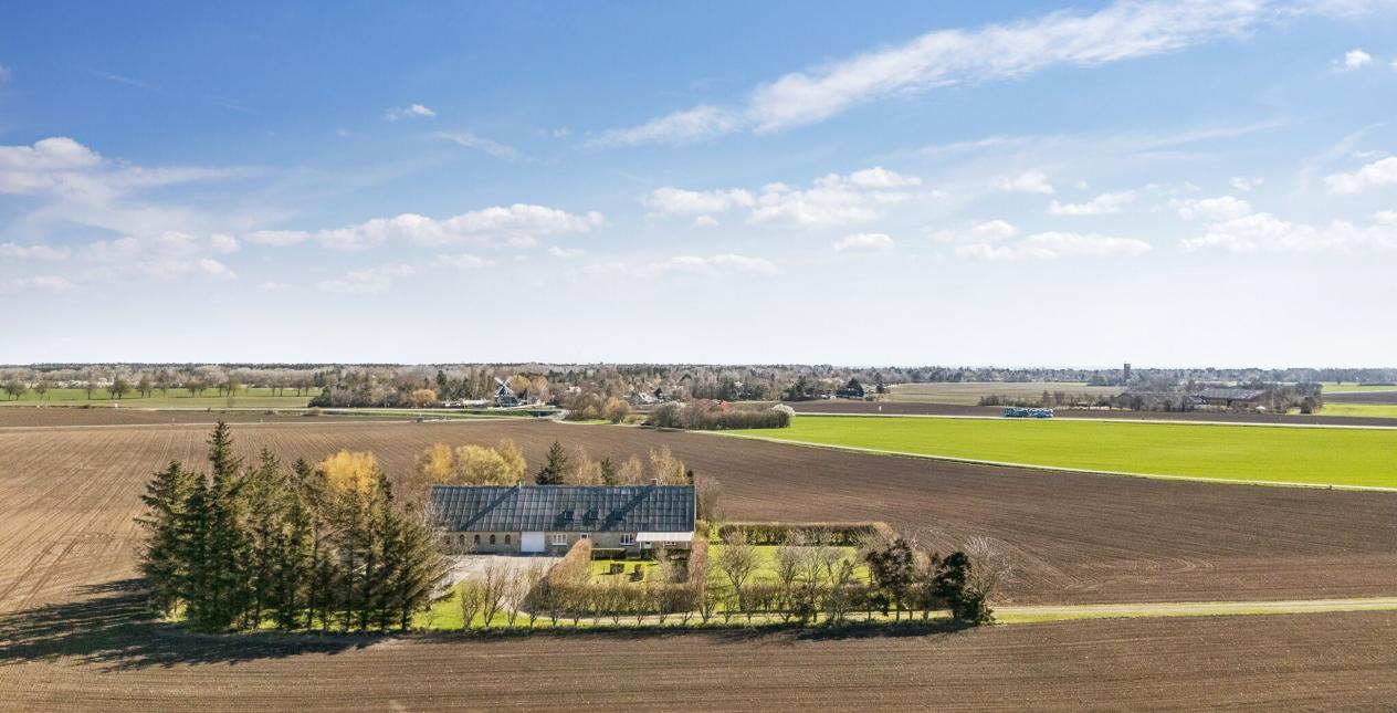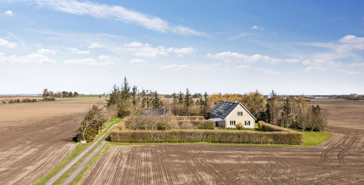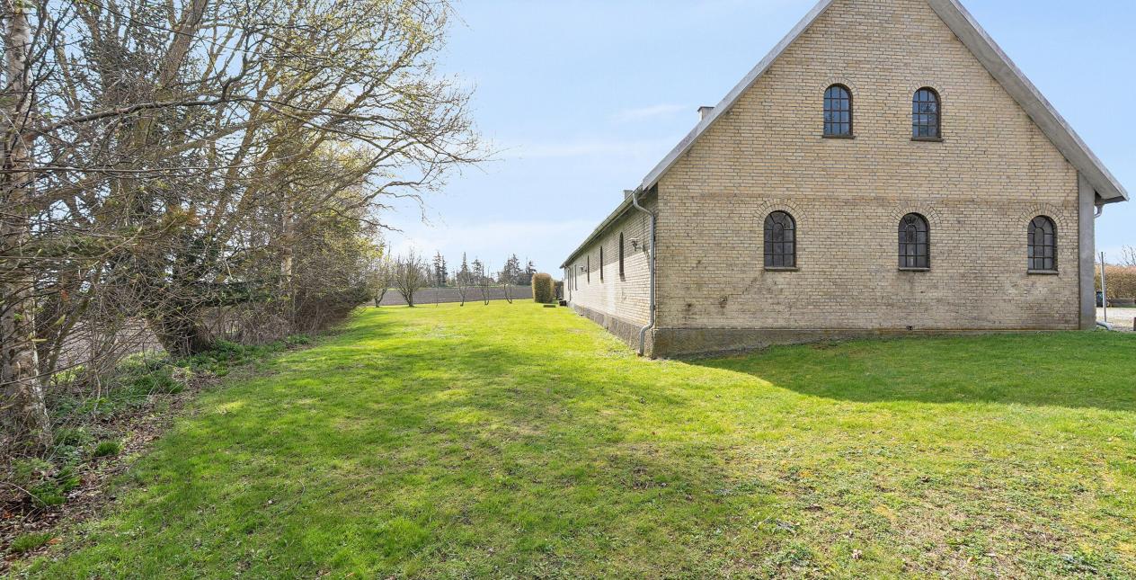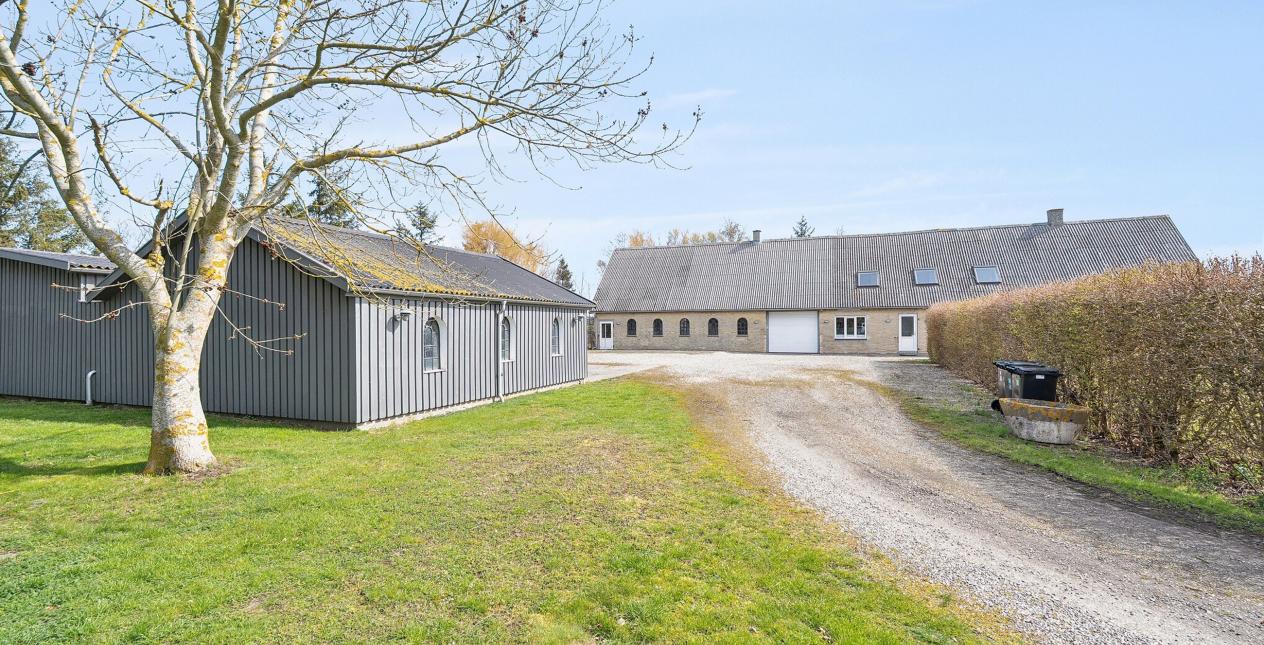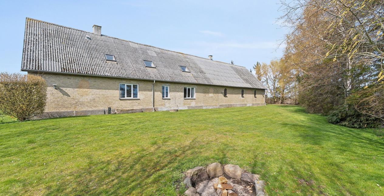 Nedlagt landejendom med dejlig og naturskøn beliggenhed ud til åbne marker og 1 km. til vandet. Stor grund på 13.245 m2, med et godt jordstykke til dyrehold. Cirka 2/3 af jorden er pt. forpagtet af en landmand, men kan tages retur til ejendommen. Ejendommen er opført som længehus på 248 m2 med direkte adgang fra beboelsen til garage og tidligere stald. Ejendommen er opført i gule mursten med eternittag.