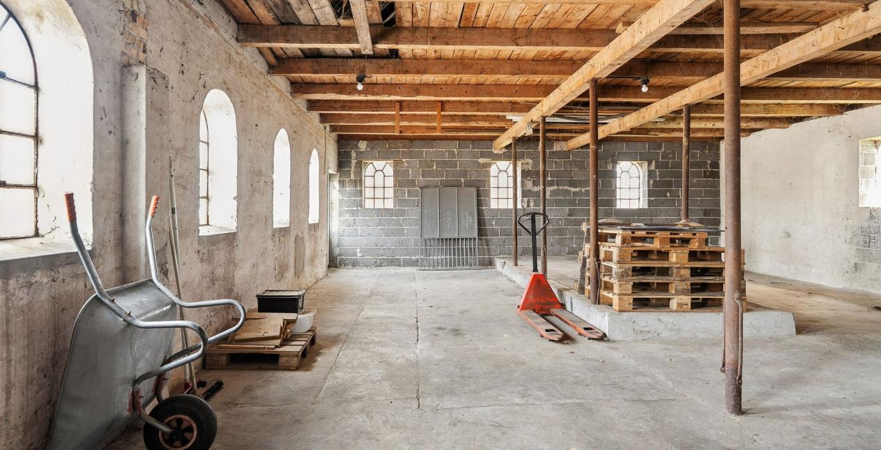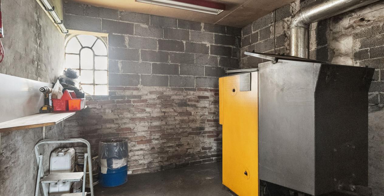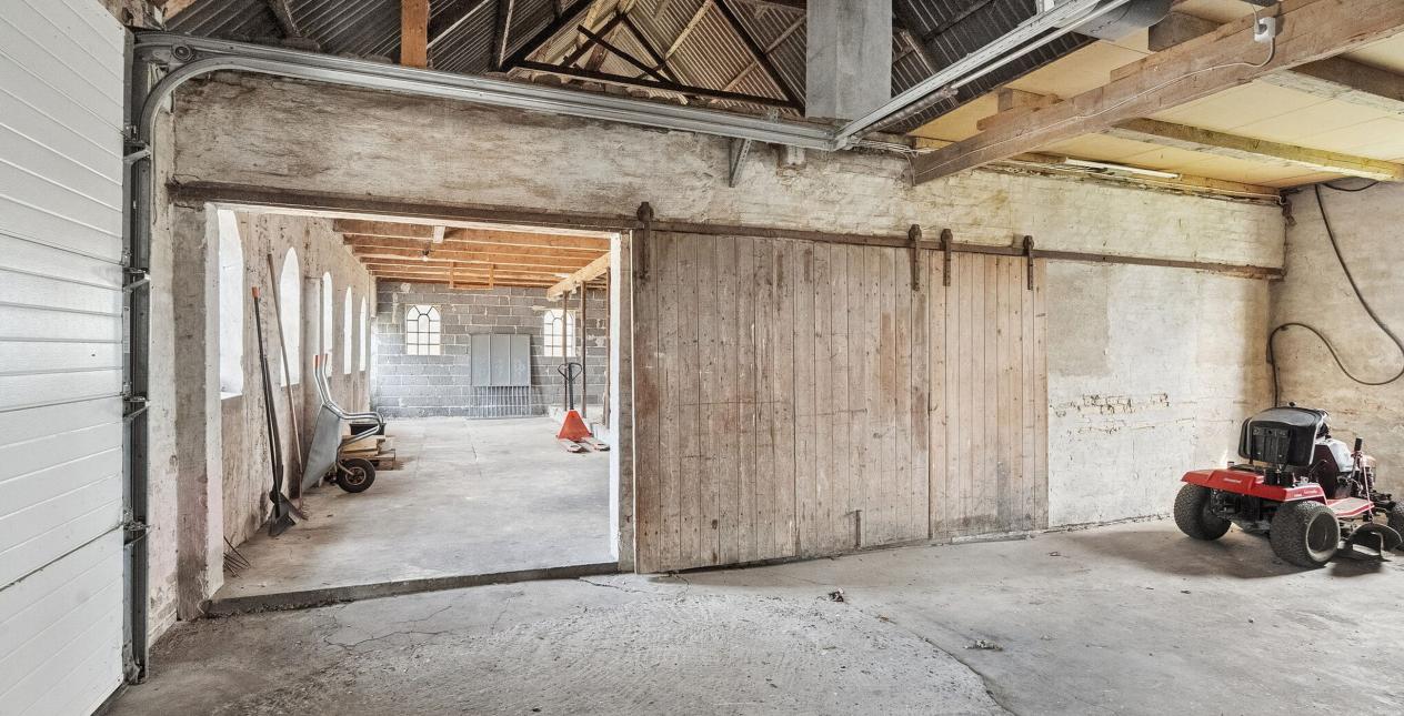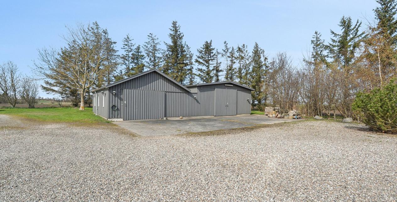 Der er sammenhængende stald, garage med elektrisk port og fyrrum med pillefyr, på i alt 162 m2. Ligeledes stort garageanlæg opdelt i to, med træbeklædning. Kan evt. indrettes til mindre dyrehold.