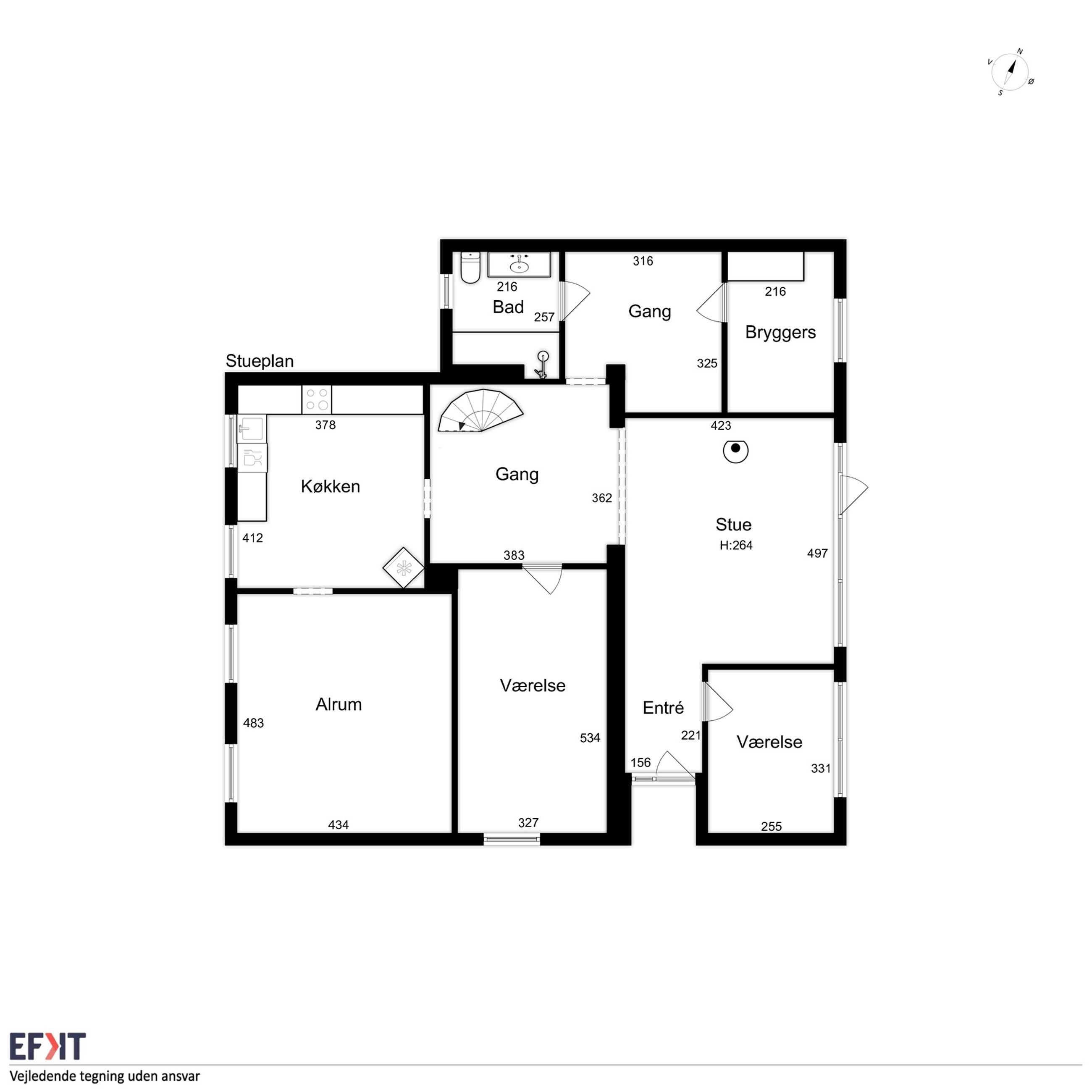 Entrè, Værelse. Opholdsstue med brændeovn og med udgang til terrassen og haven. Mellemgang med god plads og med udgang til 1. salen. Lyst køkken. Spisestue/alrum. Stort værelse.