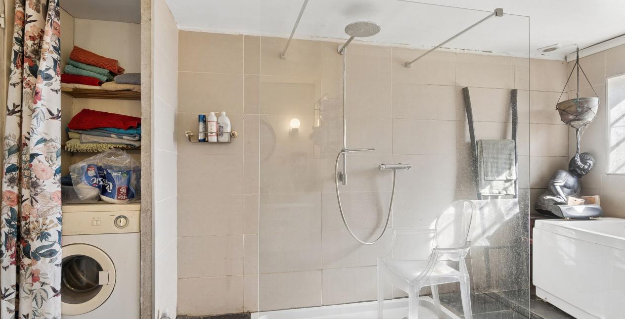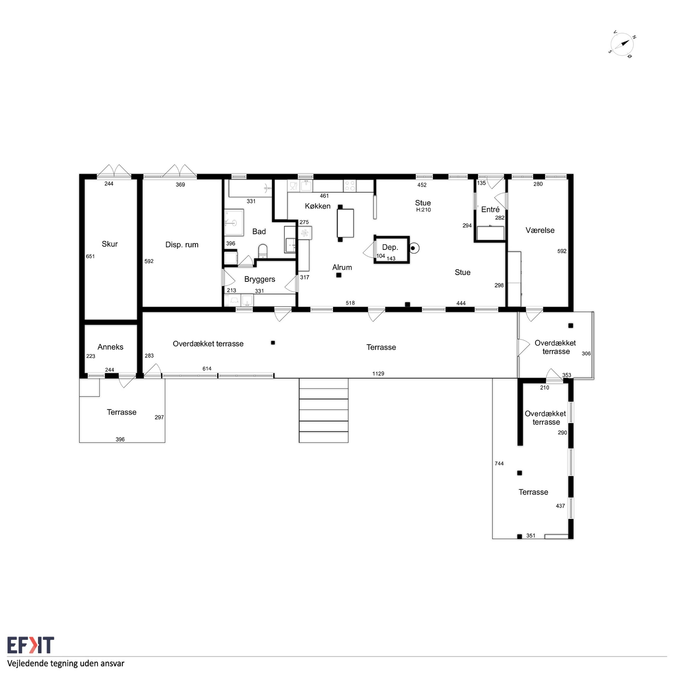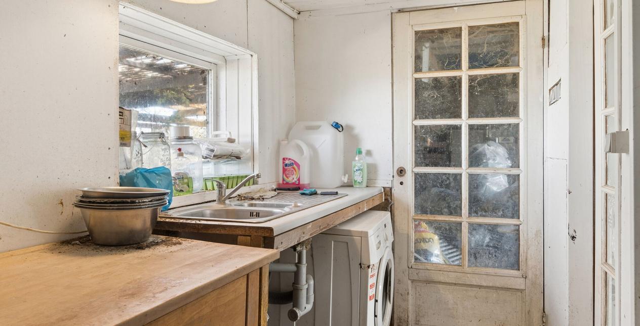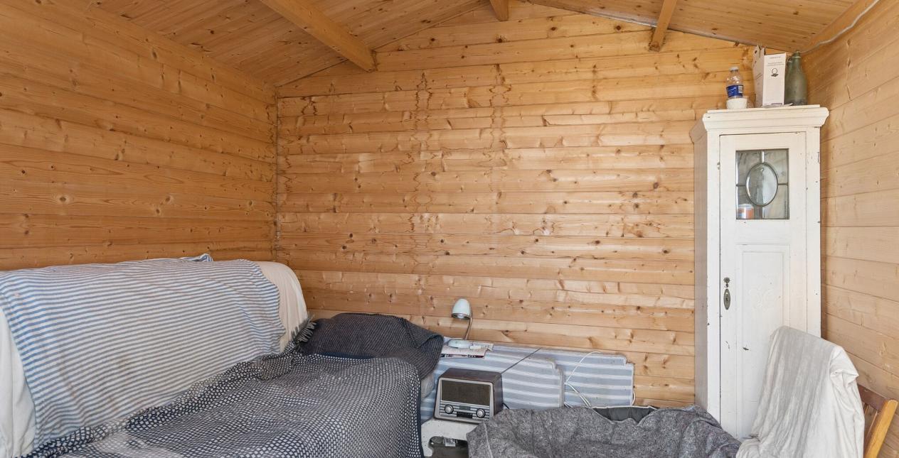 Indeholder: Entré med trægulv. Soveværelse med udgang til hundegård. Stue med varmepumpe, brændeovn, parketgulv og fantastisk udsigt ud over marken og vandet, samt udgang til træterrassen. Køkken i forbindelse med stuen. Bryggers med stik til vaskemaskine. Stort badeværelse med flisegulv, bruseniche, kar, toilet, vask og plads til tørretumbler.